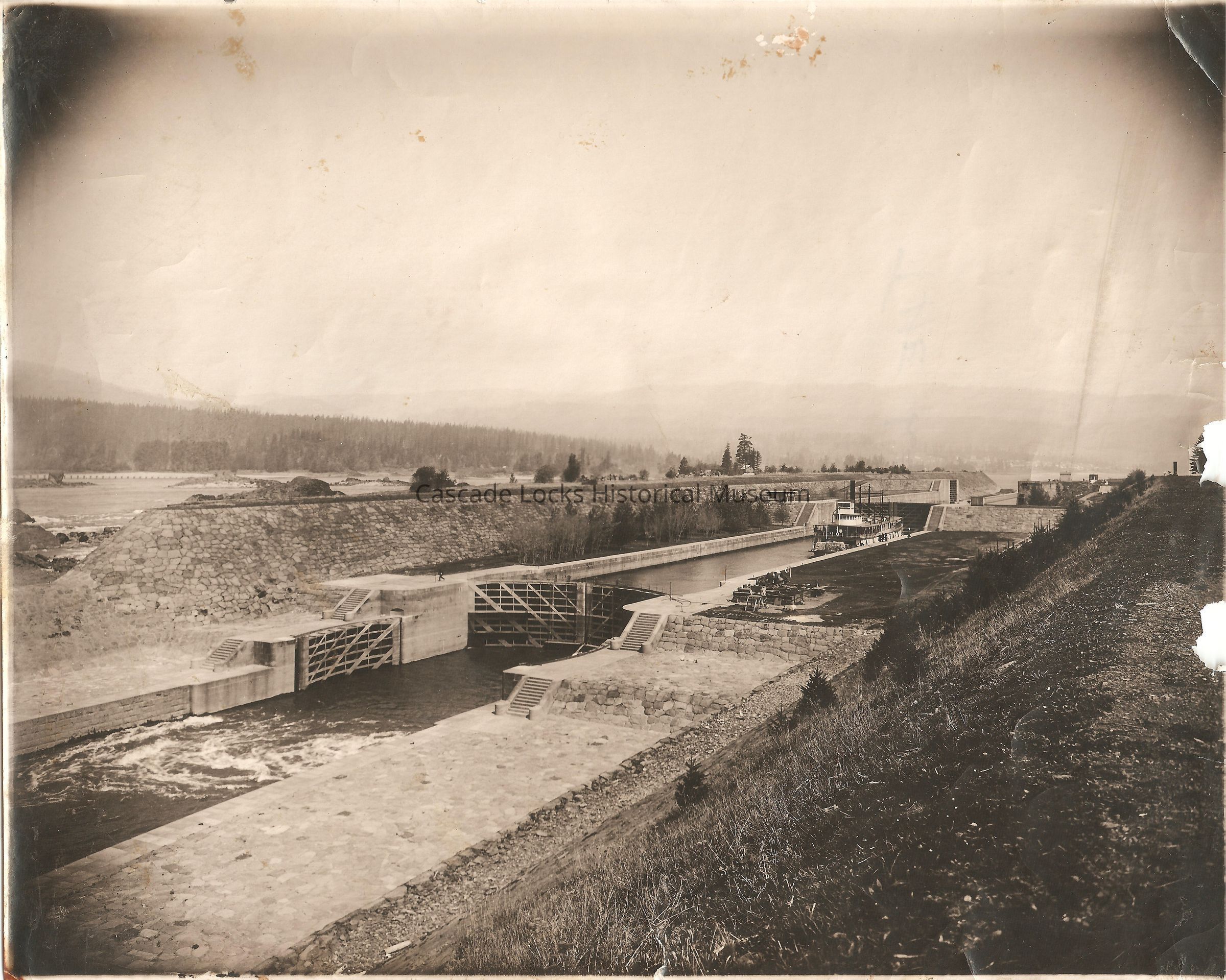 Photograph of the Cascade Locks and Canal. In the image there is a boat in the middle locks heading west. There is construction materials on the south Oregon bank. Back of image reads; "The Locks"
