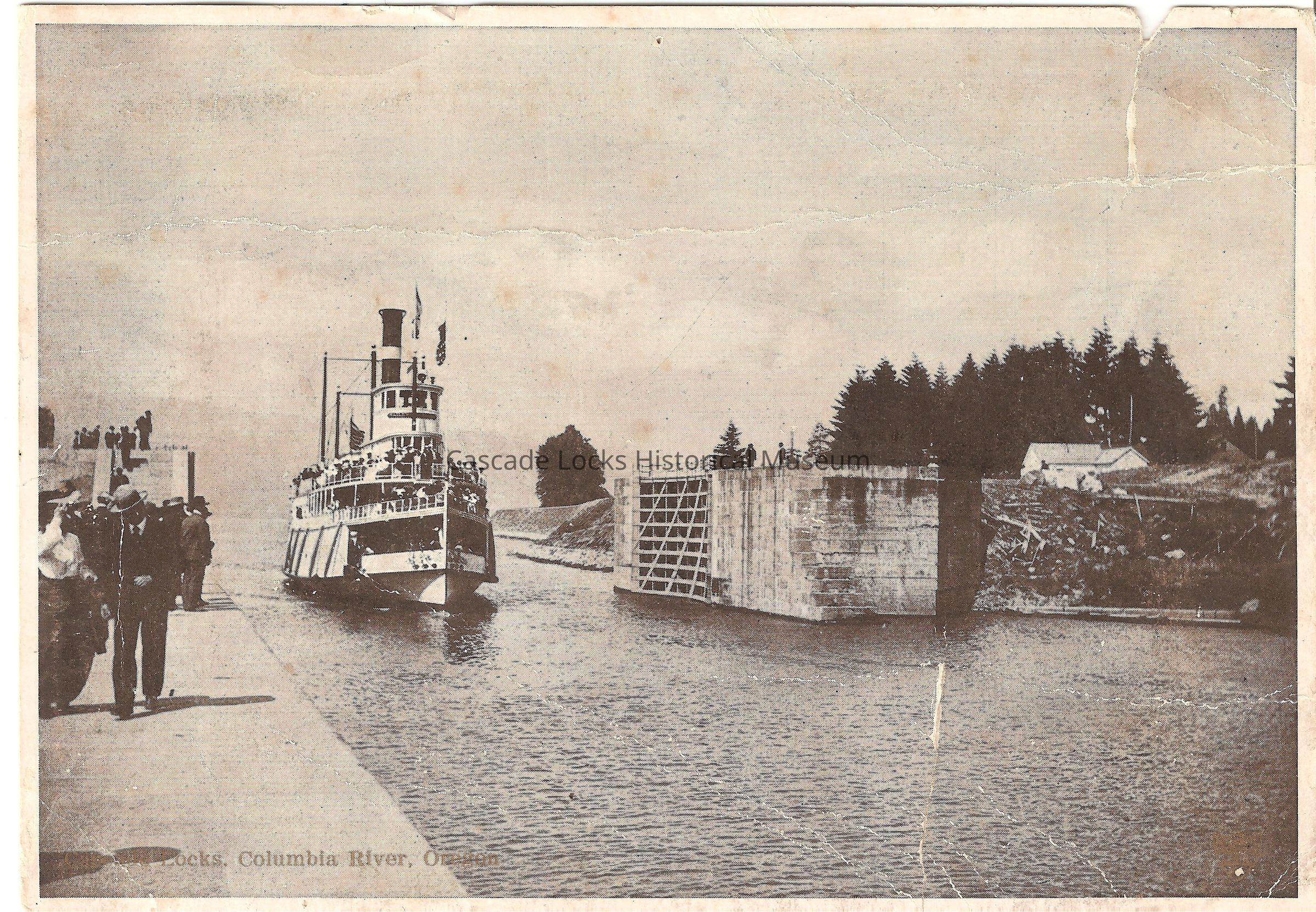 Photograph or postcard of a sternwheeler entering the Cascade Locks and Canal heading west. Photograph is taken looking southeast from Thunder Island. Left edge base reads; "Cascade Locks, Columba river, Oregon."