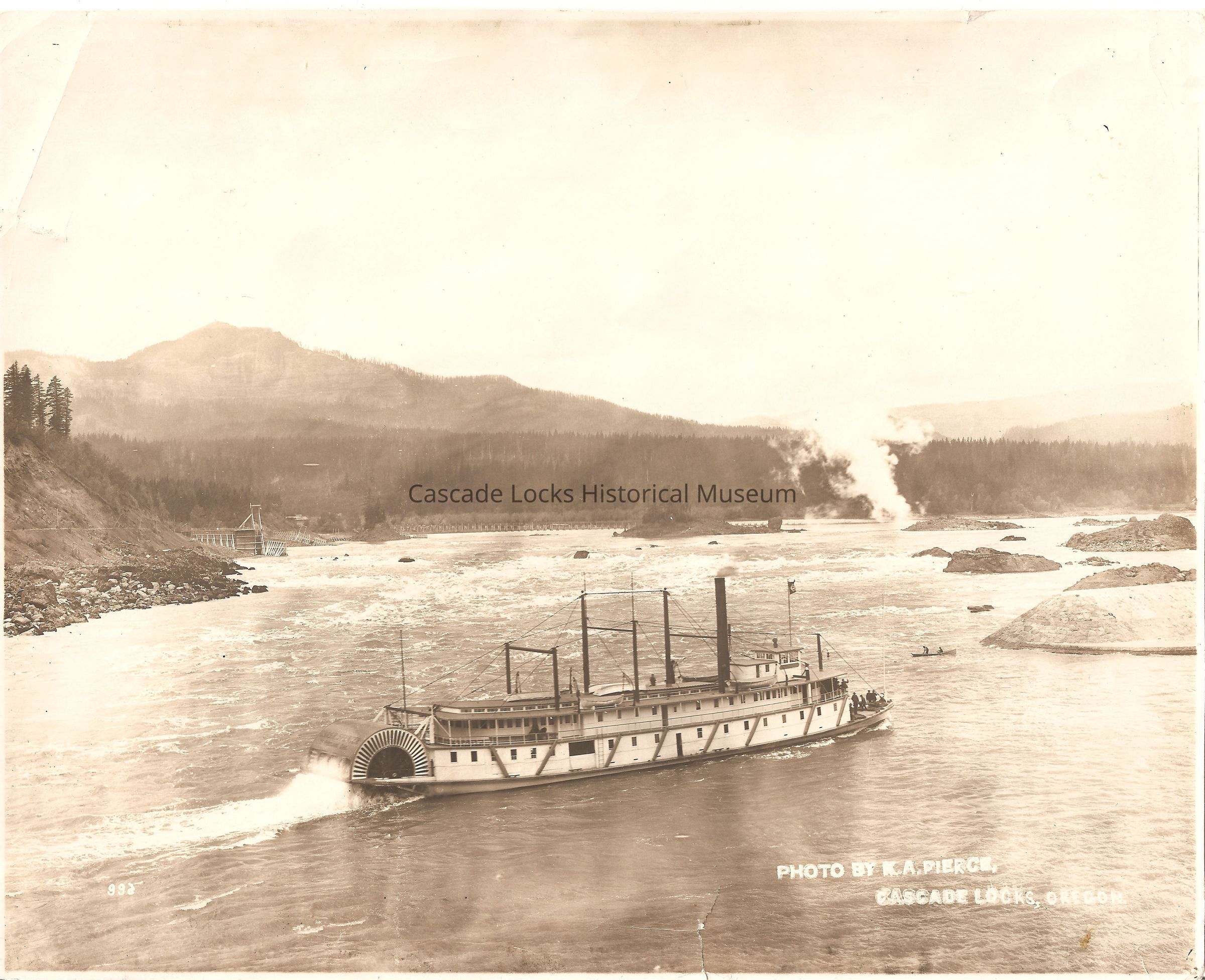 Back of image reads; "Sternwheeler, Charles R. Spencer, Approaching the canal. Remnants of trestles of old portage railway are visible on Washington shore (center). Photo, circa 1905, by K. A. Pierce. From collection of Mr. & Mrs. R. G. O'Connor, Sr."Made/Created