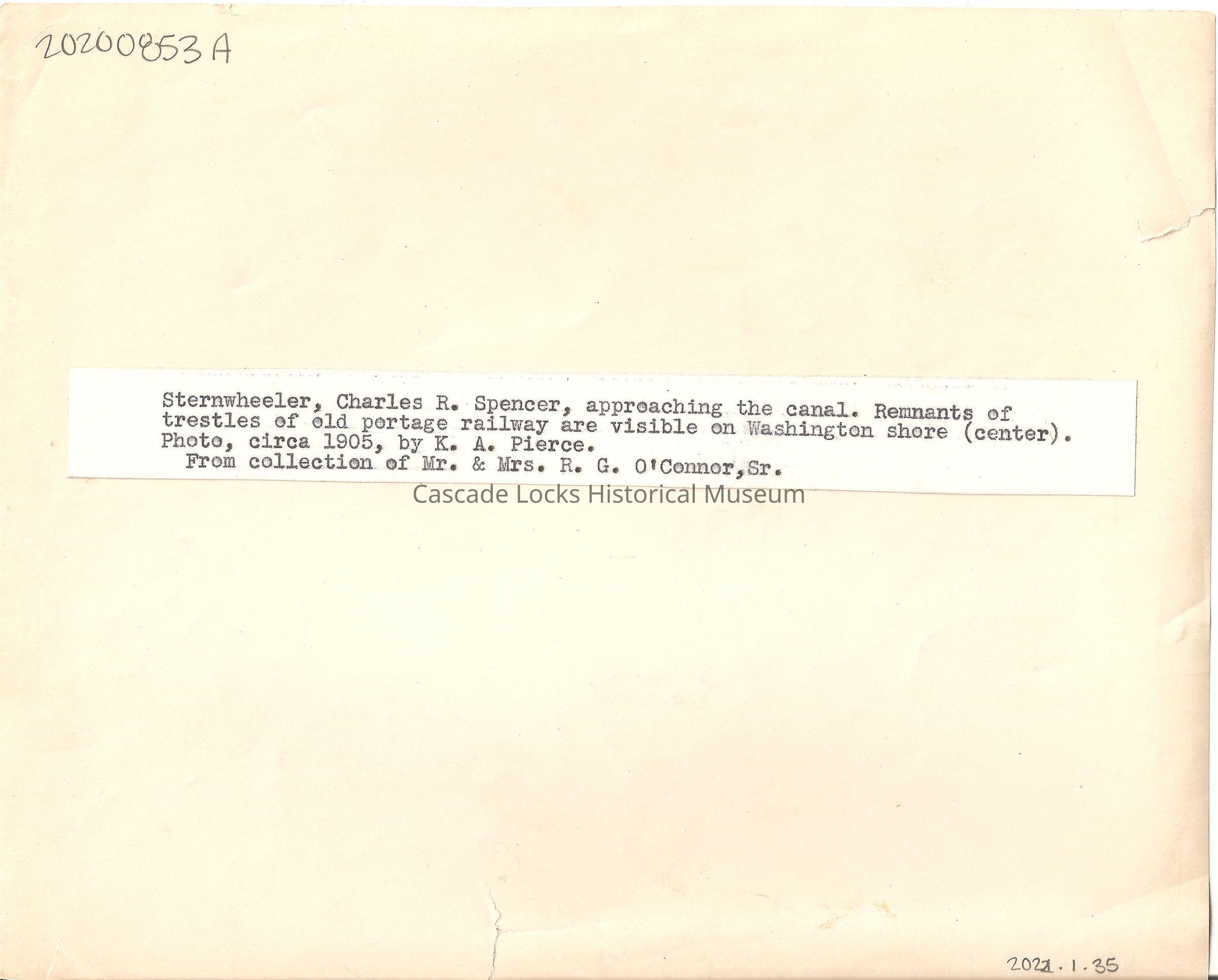 Back of image reads; "Sternwheeler, Charles R. Spencer, Approaching the canal. Remnants of trestles of old portage railway are visible on Washington shore (center). Photo, circa 1905, by K. A. Pierce. From collection of Mr. & Mrs. R. G. O'Connor, Sr."Language