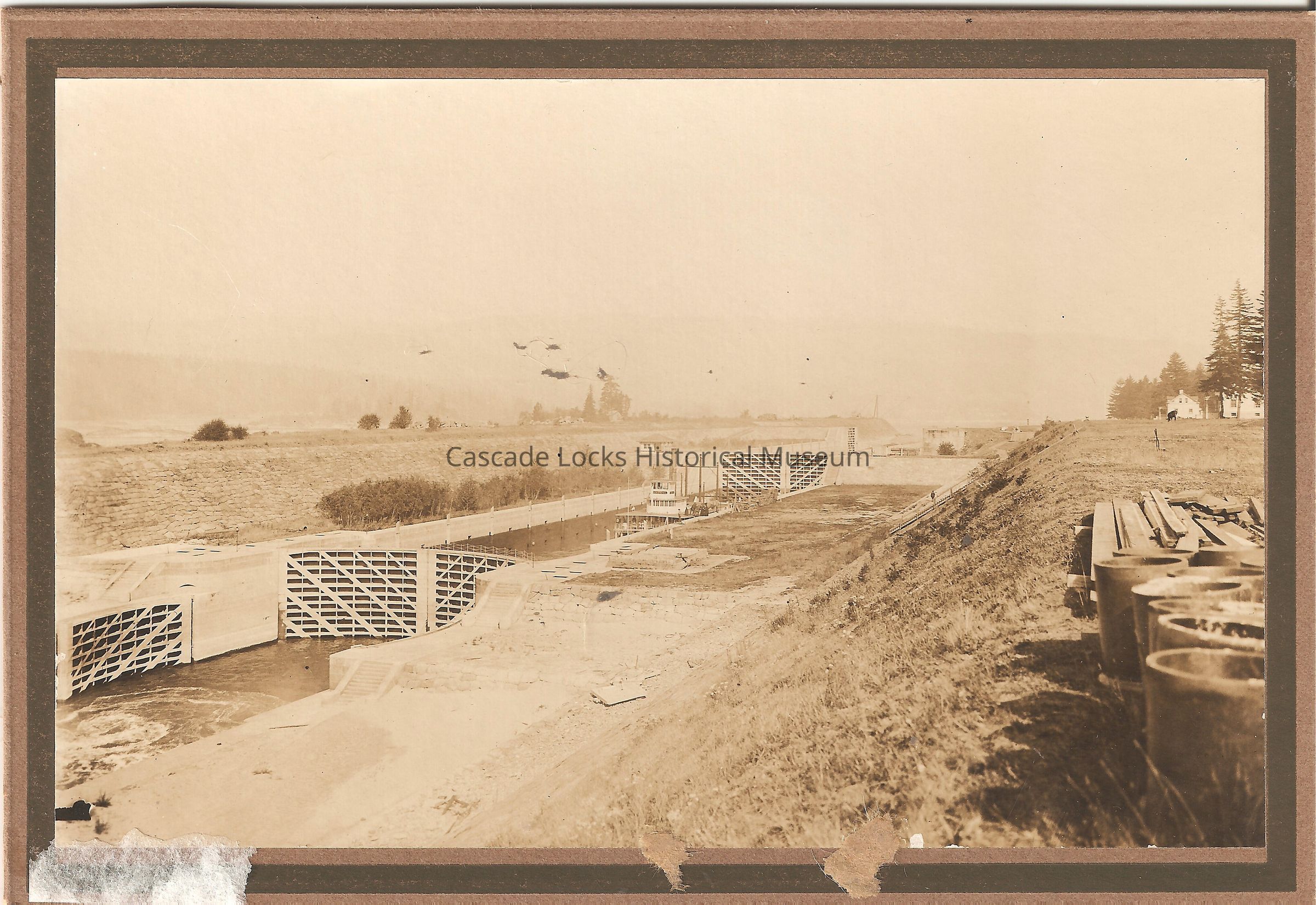 Photograph of the Cascade Locks and Canal with a boat in the gate locks. Image was taken looking southeast from the Oregon shore. There are two structures visible on the Oregon bank, lock-tenders houses, 1 and 2.