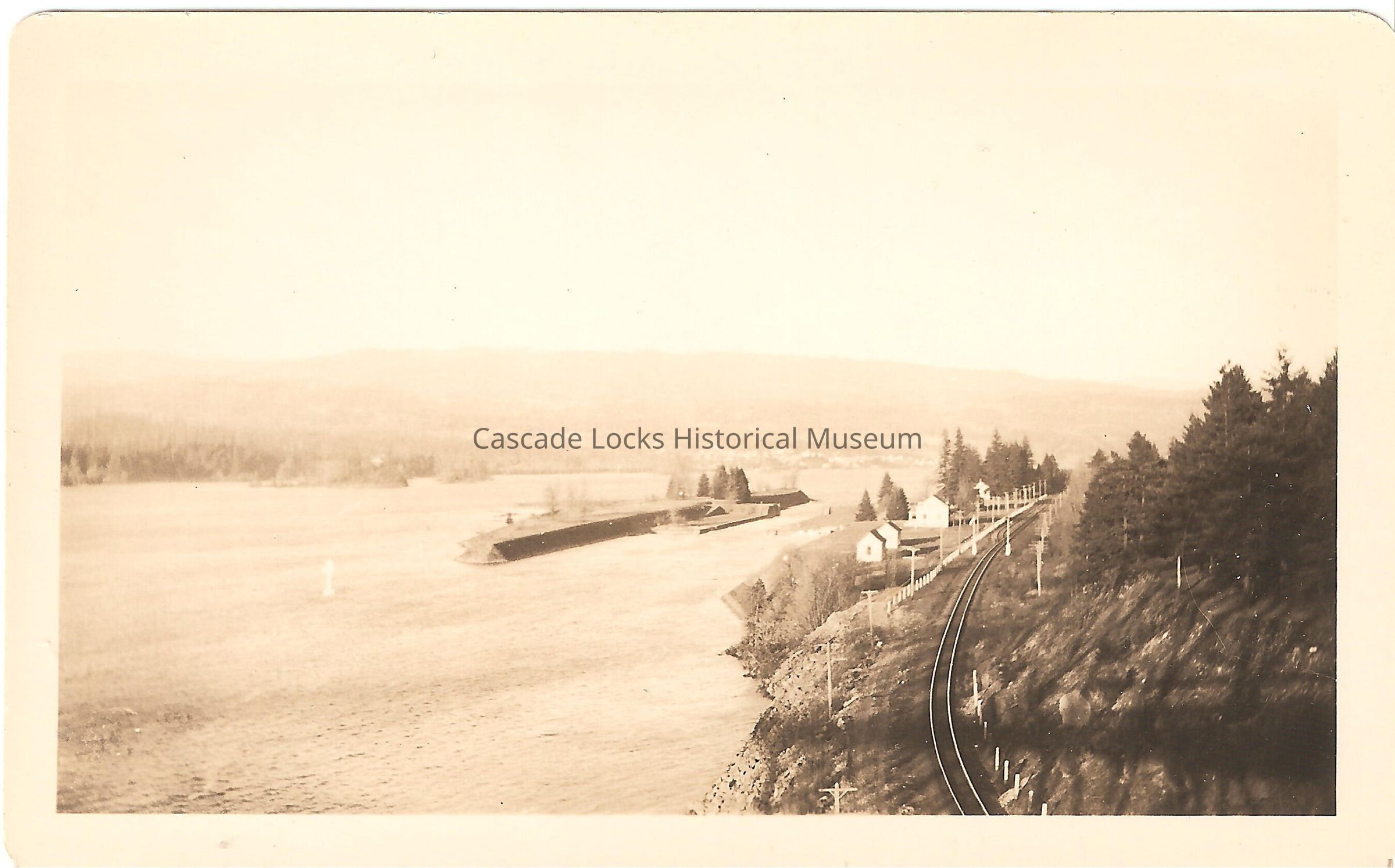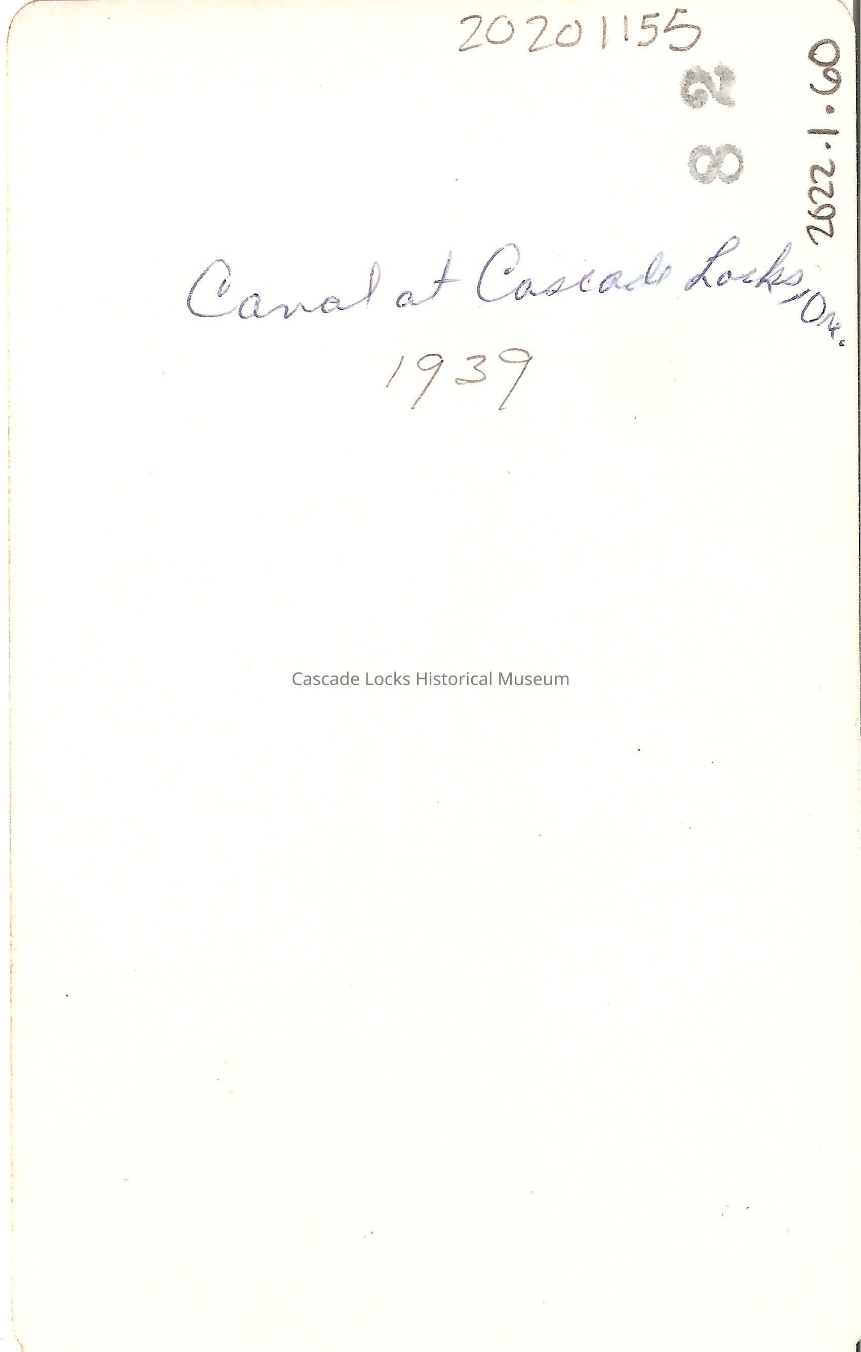 Photograph of the Cascade Locks and Canal taken from the Bridge of the Gods looking northeast. The shadow of the bridge is viable in the lower right. Back of image reads; "Cascade Locks Ore, 1939 83"