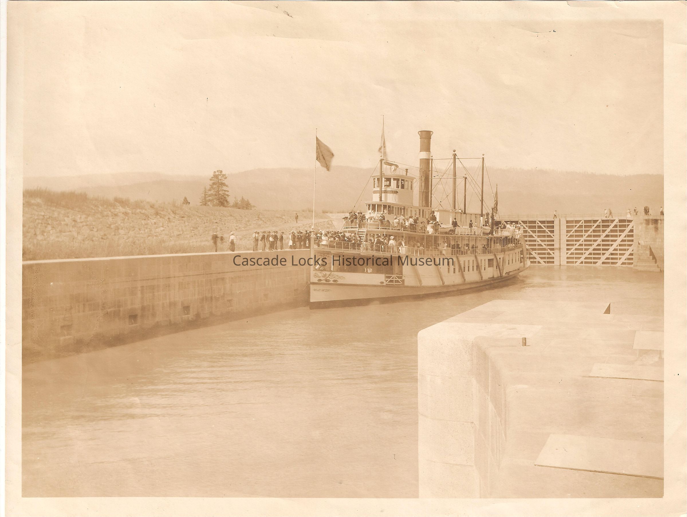 Photograph of the sternwheeler, Bailey Gatzert, in the gates of the Cascade Locks and Canal heading west. Photo is taken looking northeast.