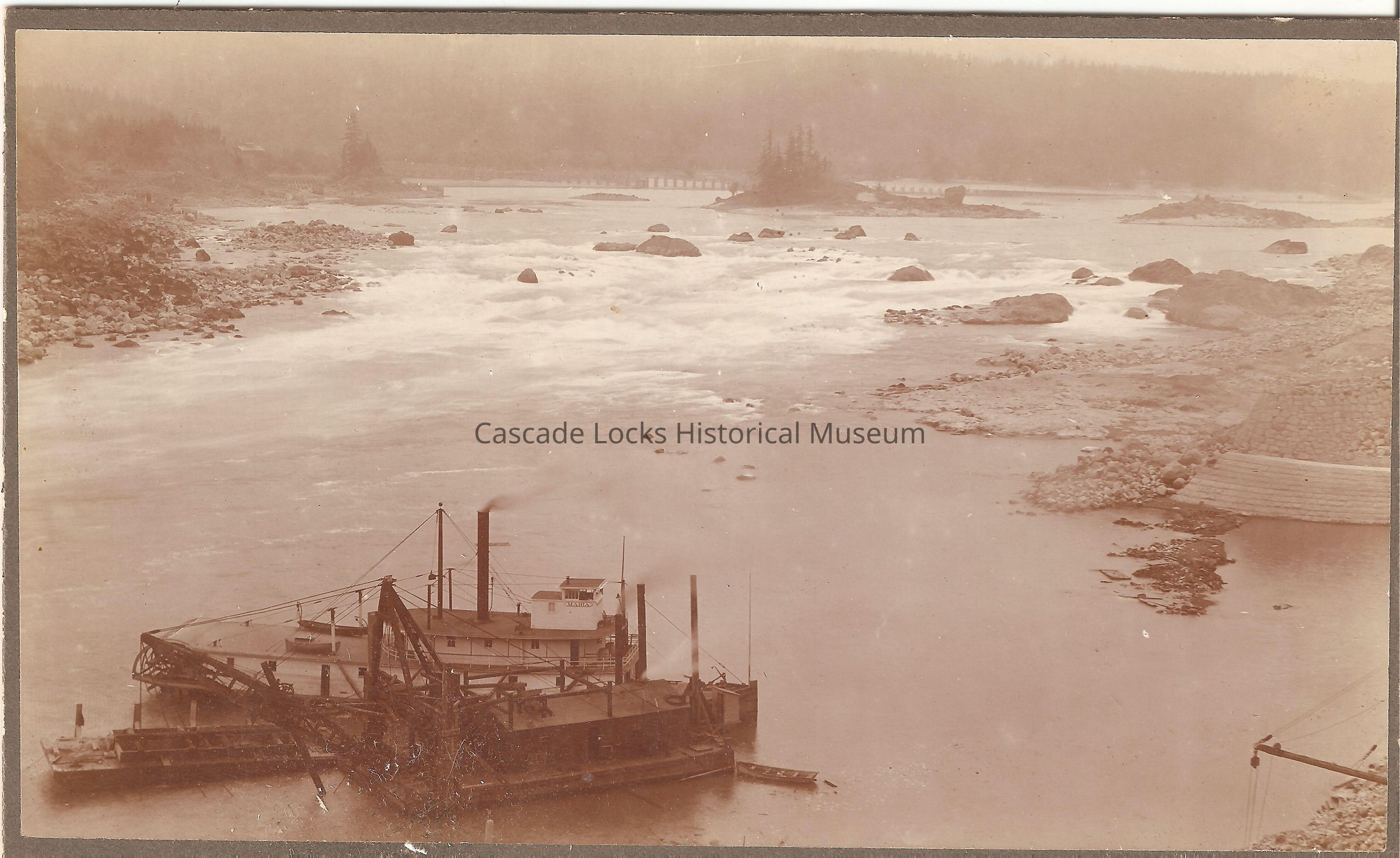 Photograph of the west end of the construction of the Cascade Locks and Canal. In the image the west end of Thunder Island is visible showing incompletion. In the image there is a barge with a crane in the left corner in close proximity to a sternwheeler. There is construction debris in the water by thunder Island.