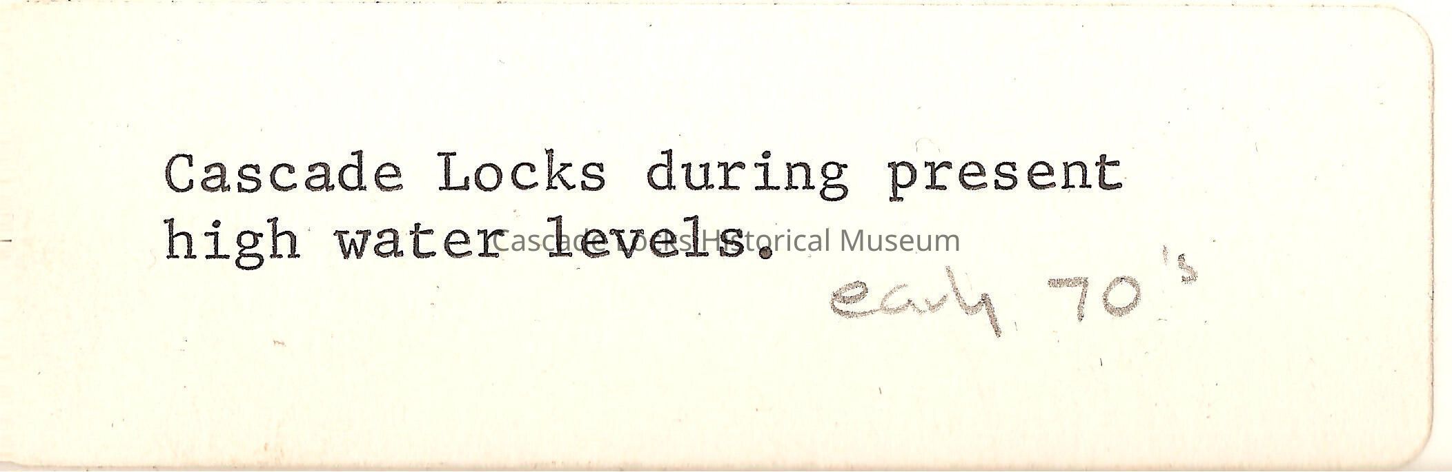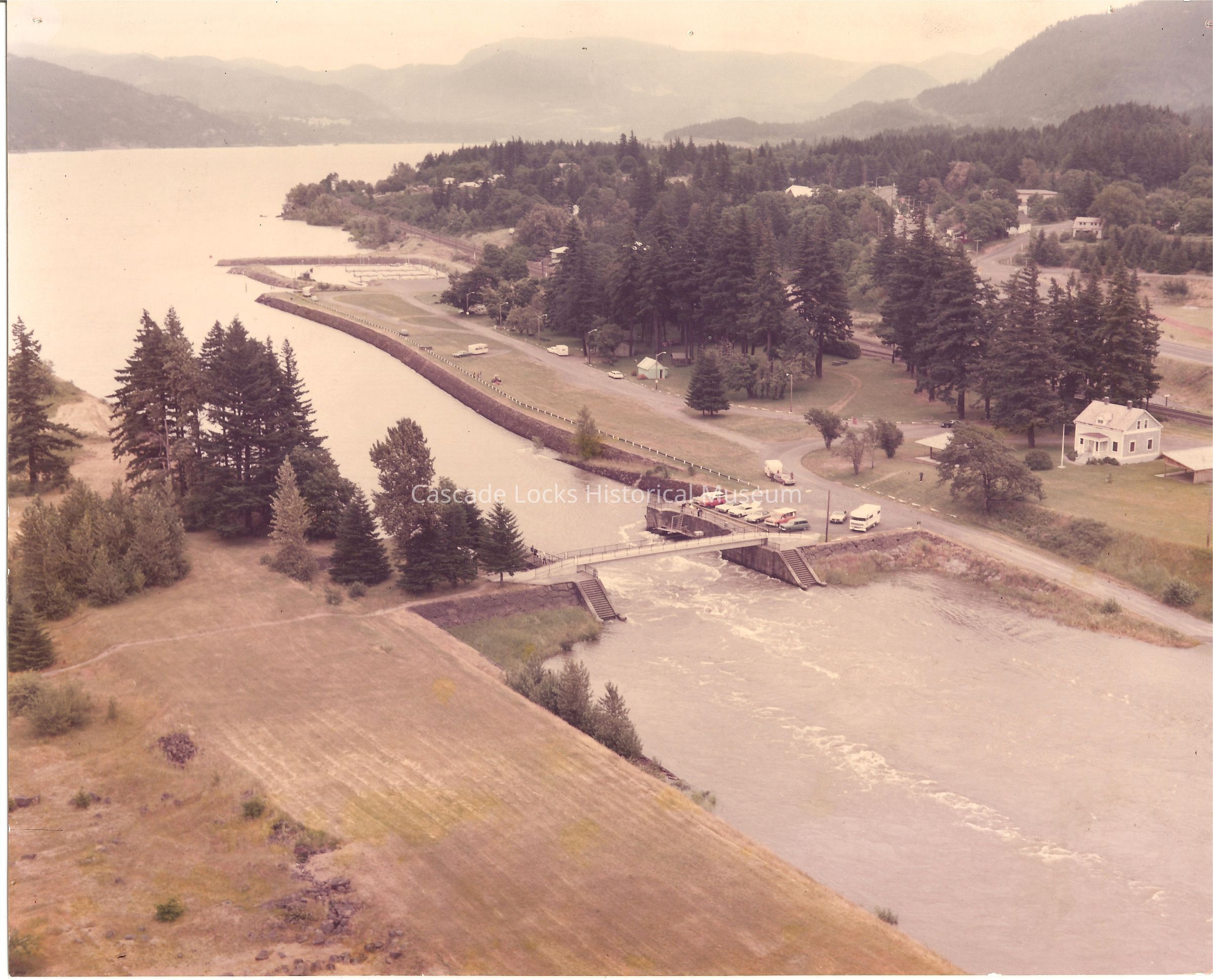 Image is in color with the landscape being majority greens and yellows of grass and trees. The Columbia river is light grayish blue with white. The sky is grayish blue with yellow. There are pops of other colors in the image from trucks, people and buildings.