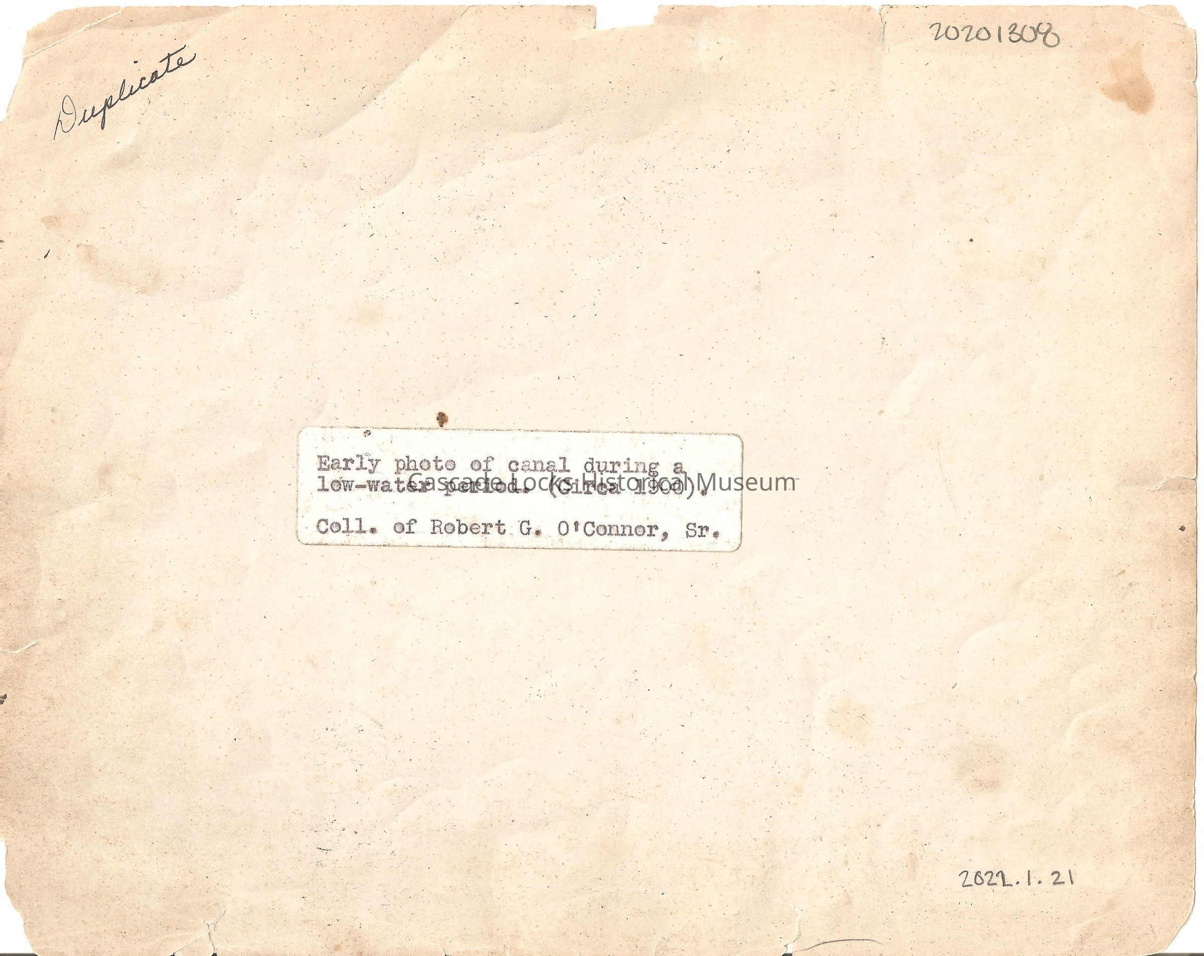 Back of image reads; "Early photo of canal during a low-water period. (Circa 1900). Coll. of Robert G. O'Connor, Sr. Duplicate"