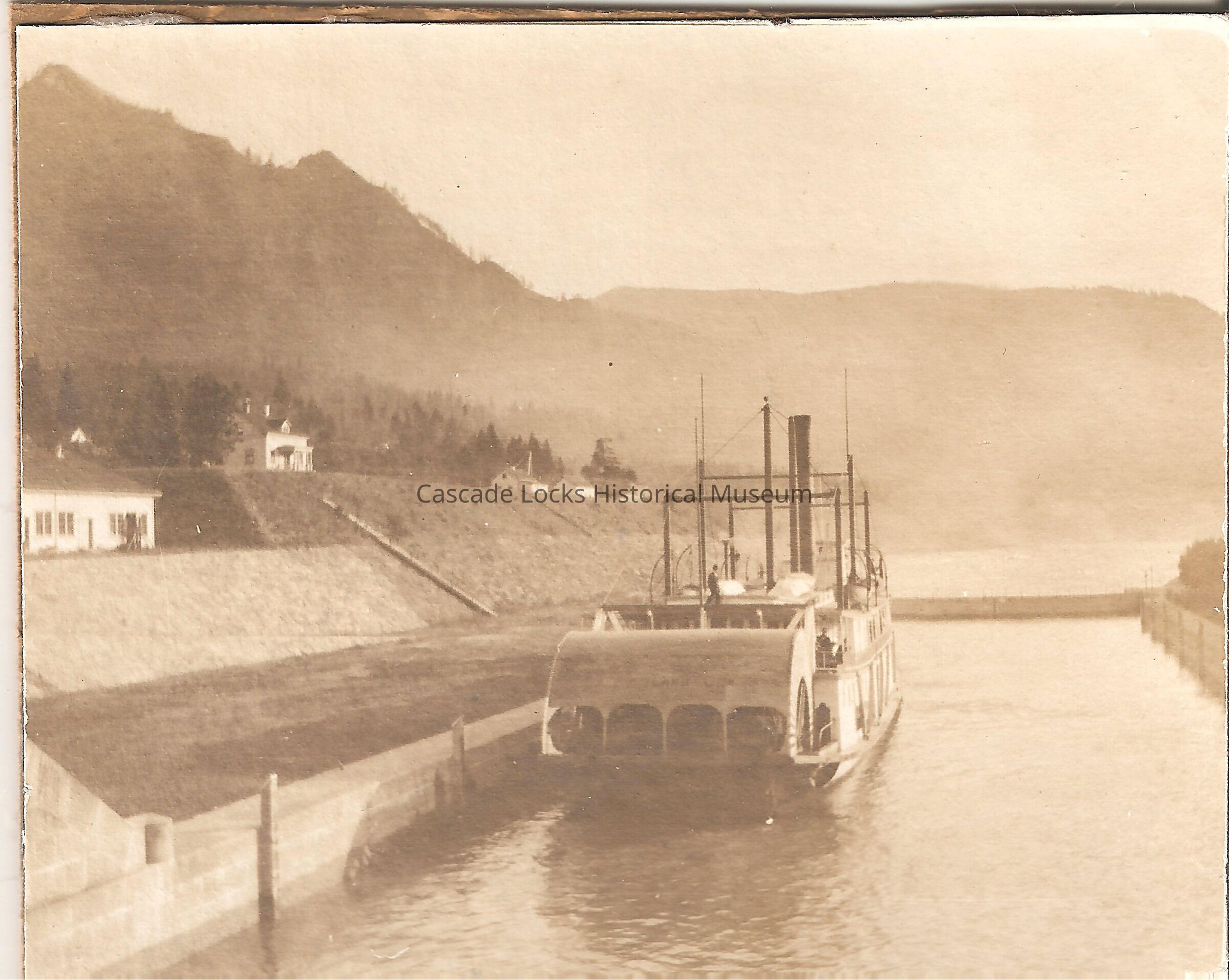 Photograph of a sternwheeler in the locks of the Cascade Locks and Canal looking southwest from the top of the eastern gates. There are five structures on the southern bank.