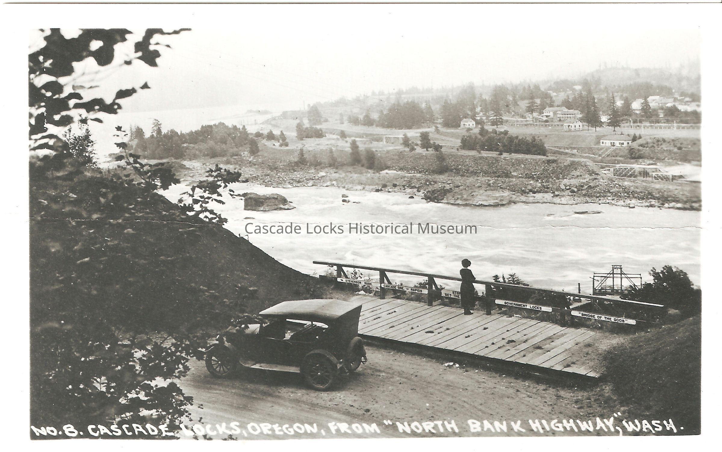 Image of a women looking out over the Columbia River at the "government" locks. She is standing in front of a railing with 5 signs. The signs reads, Stevenson Wash, Cascade Ore -Rapids, Stop __ get the __ (the women is blocking the sign), Government Locks, Bridge of the Gods. Visible in the image Cascade Locks across the river. There is a car in the bottom left of the image. Base of image says, "No. B. Cascade Locks, Oregon, From "North bank highway," Wash."Inscription/Signature/Marks