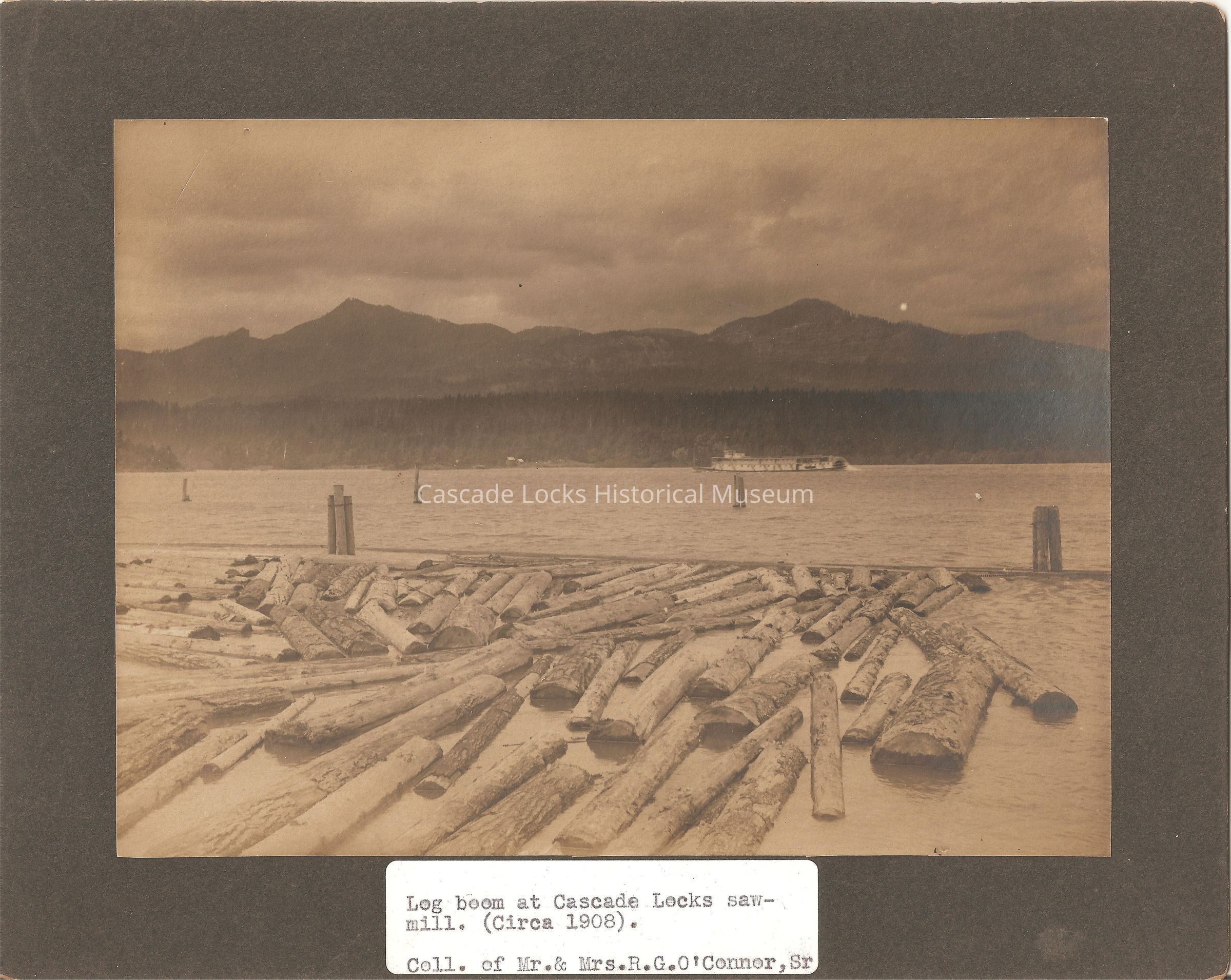 Photograph of a log boom on the southern bank of the Columbia River. In the image there is a sternwheeler heading west in the Colombia River. Across the river there are two structures on the Washington store. The base of the image is a sticker label that reads; "Log boom at Cascade Locks saw-mill. (Circa 1908.) Coll. of Mr. & Mrs. R. G. O'Connor, Sr."