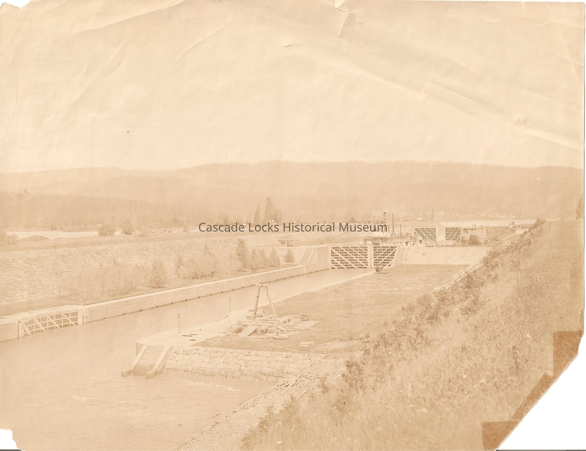 Photograph of the construction of the Cascade Locks and Canal after completion. In the image there are construction supplies on the southern bank. There are three visible structures on Thunder Island including one that is in close proximity to the canal. The lock gates are closed and there is a boat in the canal locks.