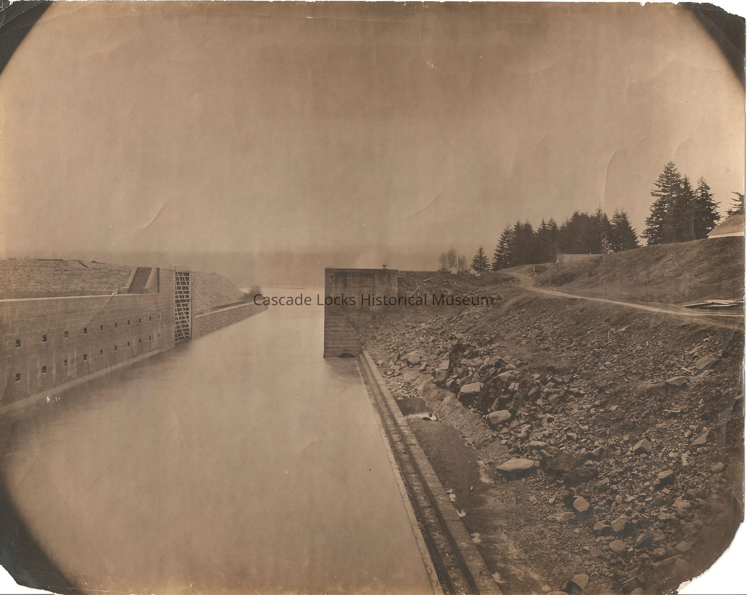 Photograph of the construction of the Cascade Locks and Canal. Photograph was taking looking northeast from the inside of the canal with the lock gates open. The left canal wall is finished along thunder Island. The right canal wall has yet to be assembled. There are two structures on the right side of the image with the roofs visible.