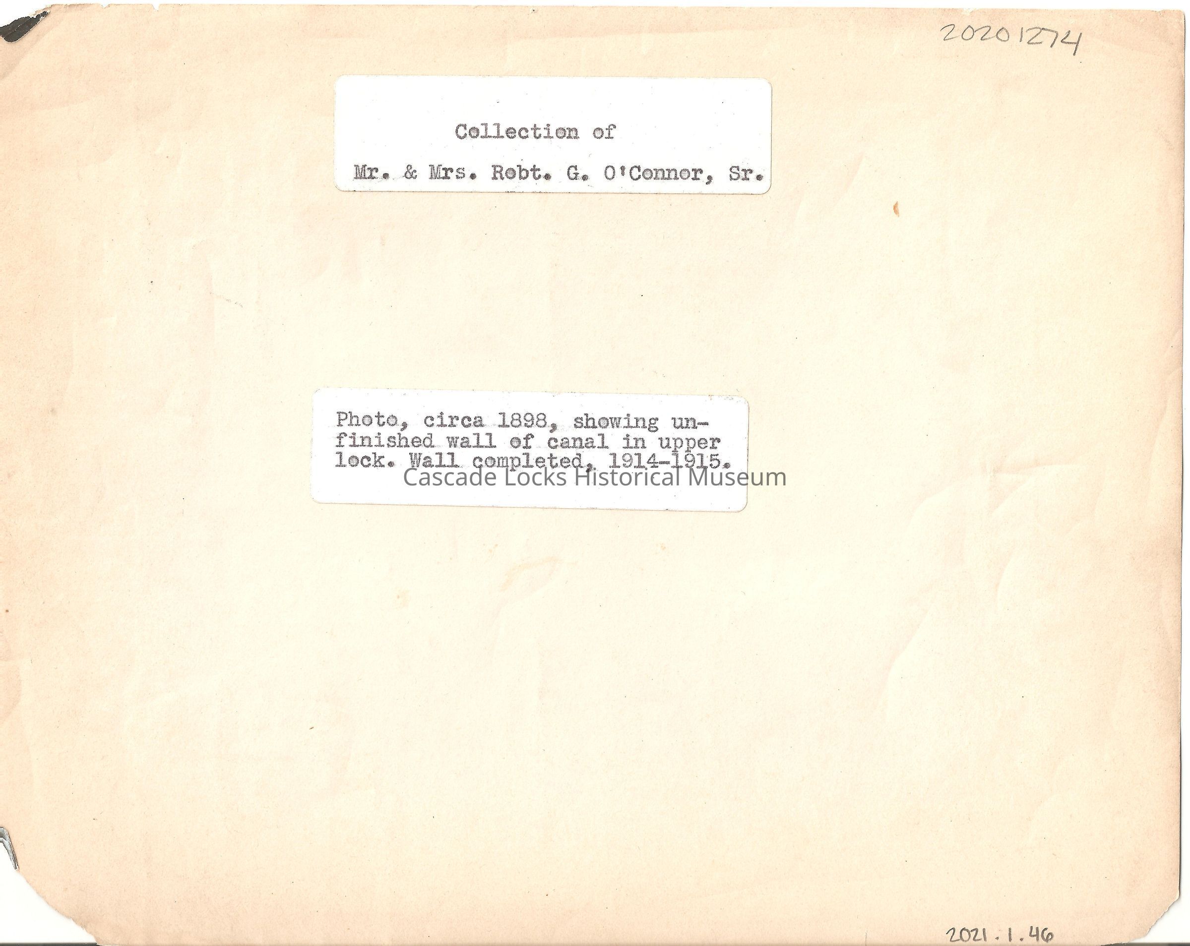 Back of image reads; "Collection of Mr. & Mrs. Robt. G. O'Connor, Sr. photo, circa 1898, showing unfinished wall of canal in upper lock. Wall completed, 1914-1915."Inscription/Signature/Marks