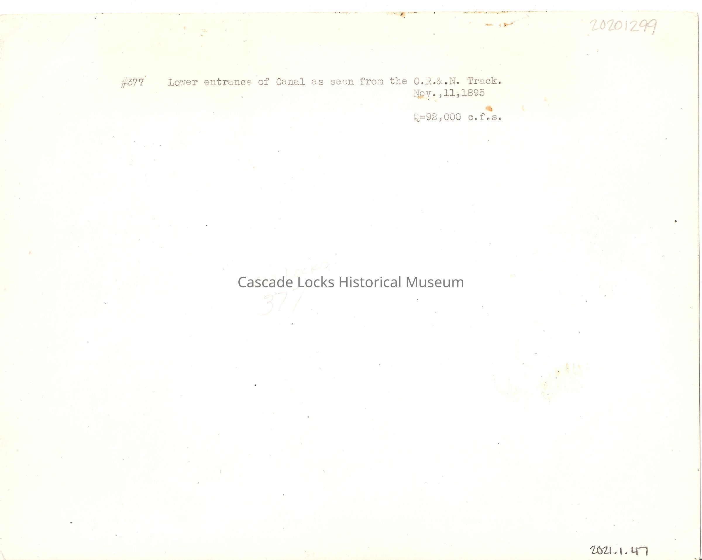 Back of image reads; "#377 lower entrance of canal as seen from the O.R.&N. track. Nov 11, 1895. Q=92,000 c.f.s."Inscription/Signature/Marks