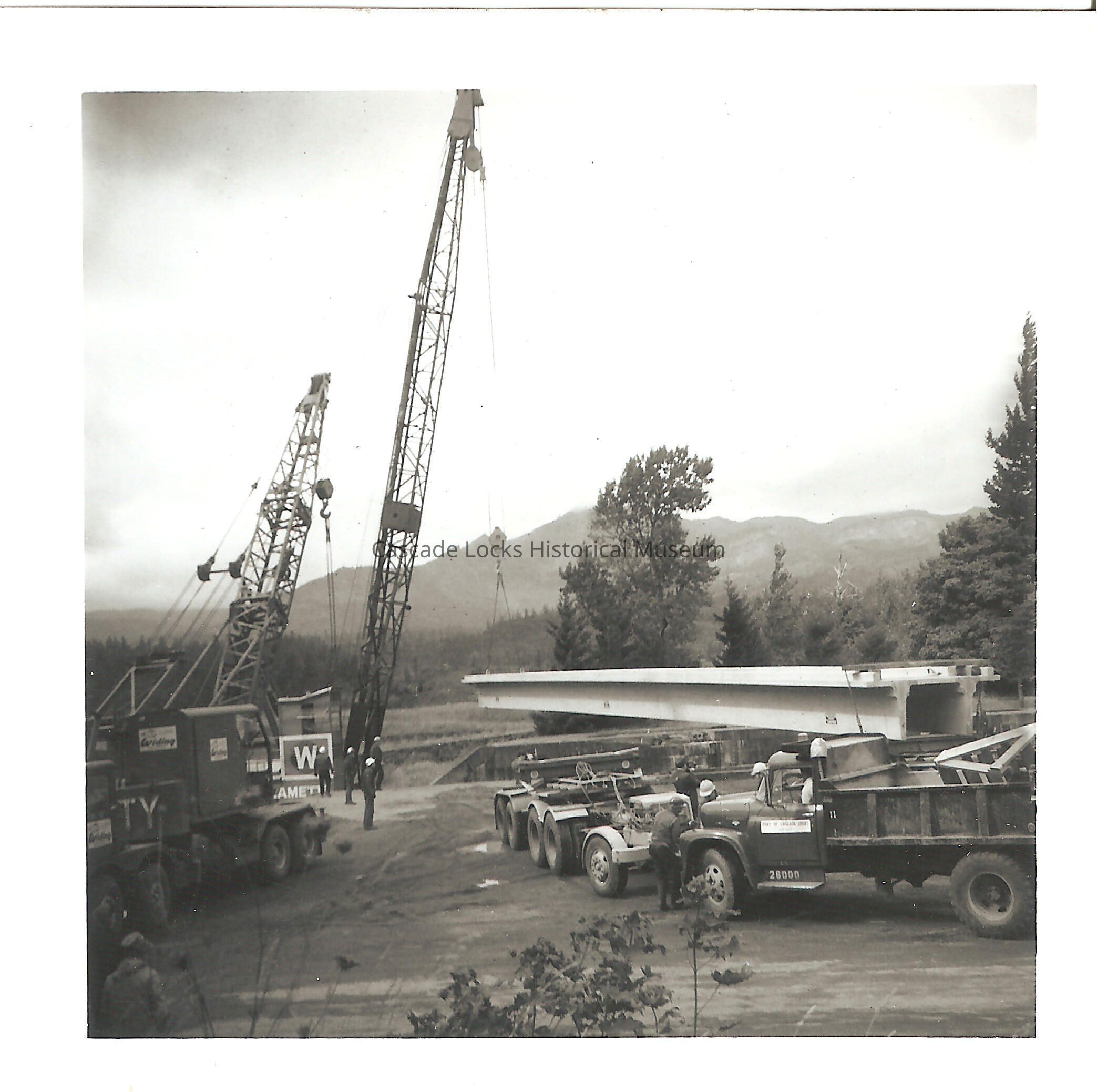 Image of a crane on a barge in the Cascade Locks and Canal lifting a walking bridge into place that connects Thunder Island to the main shore. The side of the crane reads, "Willamette pile-driving, dredging, and Marine construction Co."