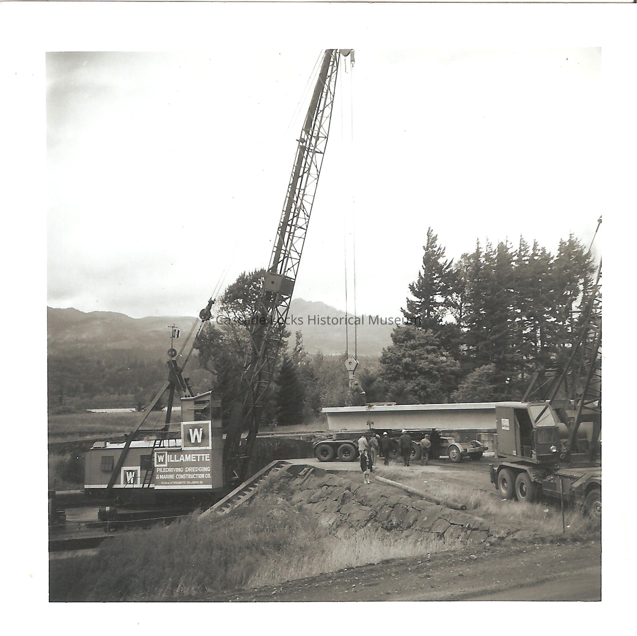 Image of a crane on a barge in the Cascade Locks and Canal lifting a walking bridge into place that connects Thunder Island to the main shore. The side of the crane reads, "Willamette pile-driving, dredging, and Marine construction Co."