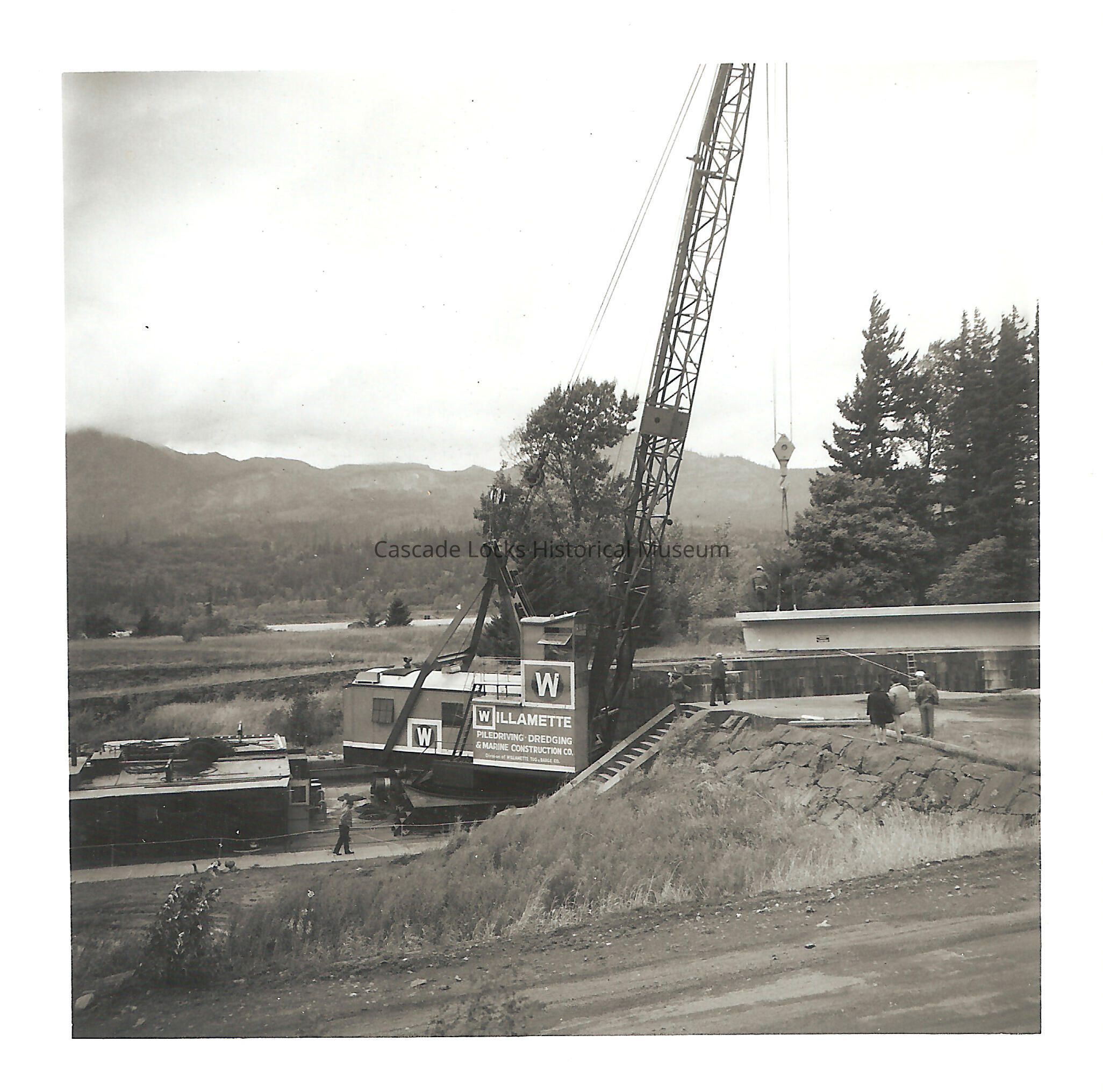 Image of a crane on a barge in the Cascade Locks and Canal lifting a walking bridge into place that connects Thunder Island to the main shore. The side of the crane reads, "Willamette pile-driving, dredging, and Marine construction Co."
