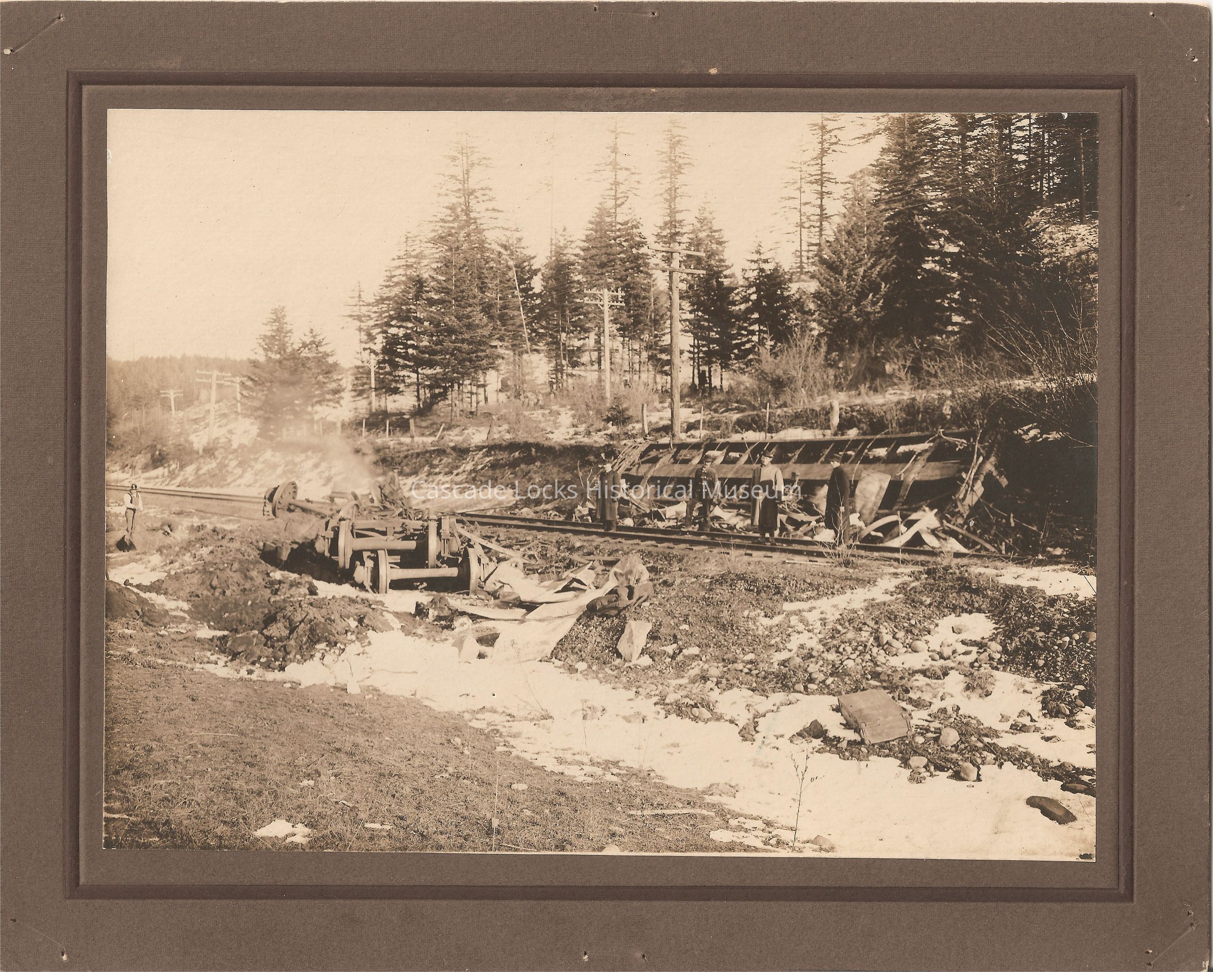 Photograph of five men posing in close proximity to a railroad track. In the image there are train axels and debris. There is a luggage trunk in the bottom right of the image.