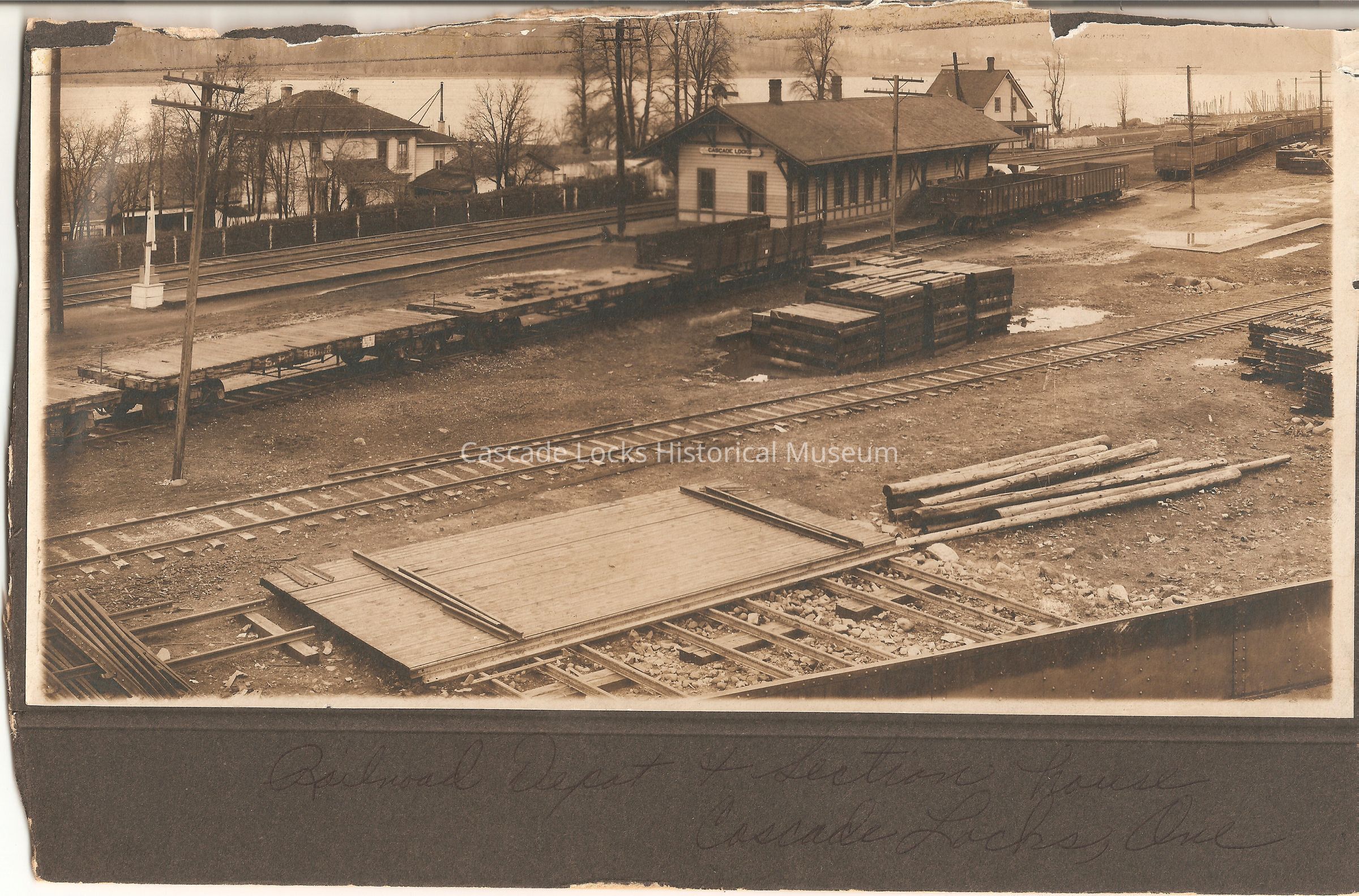 Photograph of the railroad depot and section house at Cascade Locks. In the image there is four railroad tracks with a station building in the middle. In the background there are two houses in close proximity to the Columbia River which can be seen behind them. In the foreground of the image there are stacks of railroad and powerline construction materials such as stacks of railroad ties, powerline log poles, and metal railings. The railroad car on the tracks on the side of the station reads, "O.S.L." (Oregon Short Line Railroad). On the base of the image is written: "Railroad Depot & Section House. Cascade Locks, Ore."Inscription/Signature/Marks