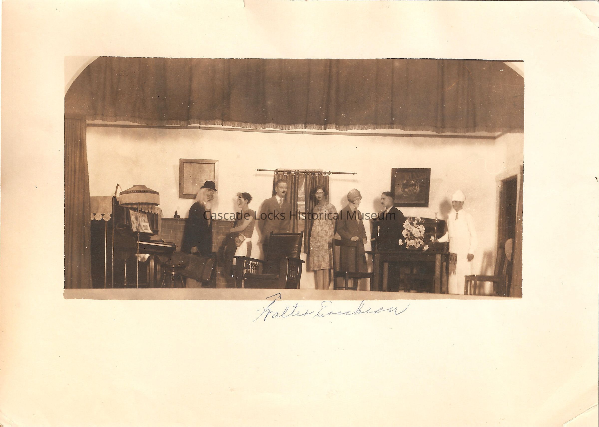 Photograph of a school musical or play on stage performing. The stage is made up of seven student performers that appear to be three females and four males dressed in costumes. Stage is set-up in a living room set-up. Front base of card has inscription of Walter Erickson with a sign pointing to Walter Erickson.