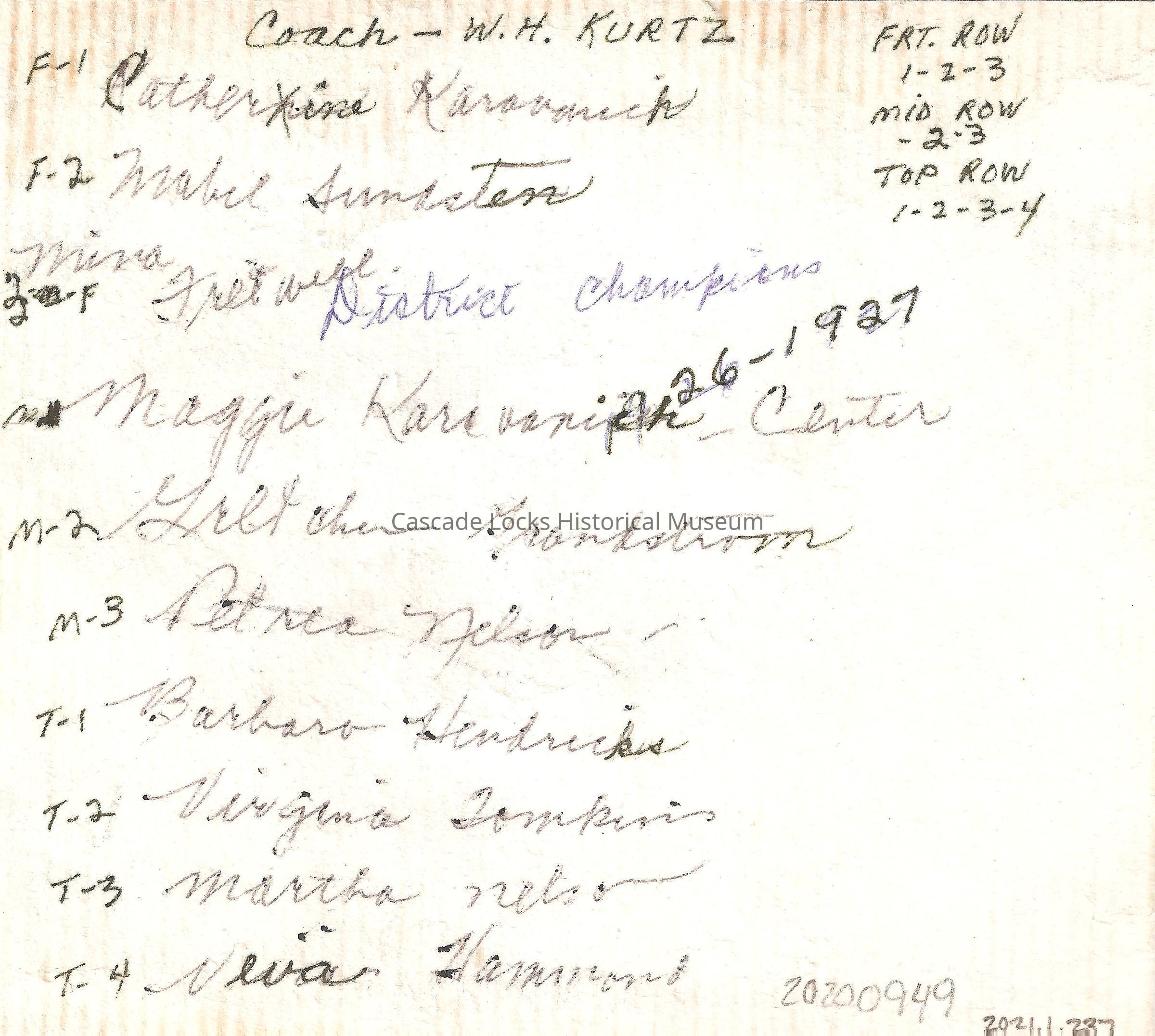 Back of card reads; Coach W. H. Kurtz, FRT. Row 1-2-3, Mid. Row- 1-2-3, Top Row- 1-2-3-4. District Champions 9-26-1927. F-1 Catheina Kuravarch, F-2 Mabel Grandstrom, F-3 Mira Frelwell, M-1 Maggie Karr___ Center, M-2- Gretchen Grandstrom, M-3 Petrea Nelson, T-1 Barbara Hendricks, T-2 Virgina Tompins, T-3 Martha Nelson, T-4 Vera HammansLanguage