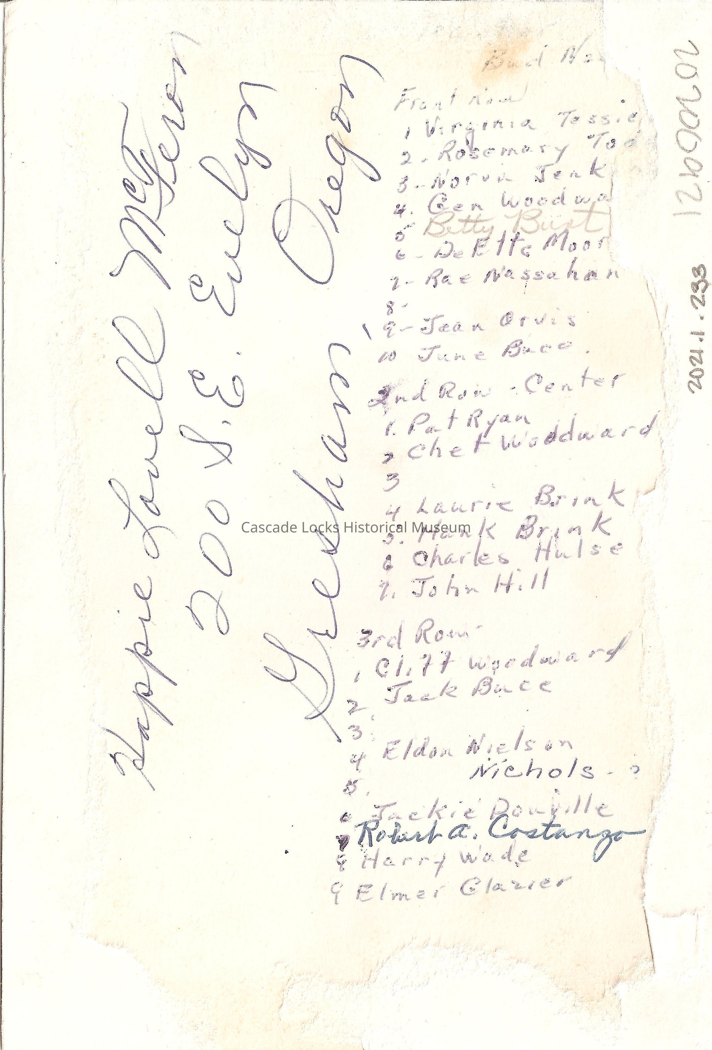 Back of card reads; Front Row- 1)Virginia Tessie, 2) Rosemary Tod___, 3) Norva Jenkins, 4) Gen Woodward, 5) Betty Bunt, 6) DeEtte Moore, 7) Rea Nassahan, 8) _____ _____, 9) Jean Orvis, 10) June Buco, 2nd Row- 1) Pat Ryan, 2) Chet Woodward, 3) ___ ___, 4) Laurie Brink, 5) Hank Brink, 6) Charles Hulse, 7) John hill, 3rd Row- 1) Cliff Woodward, 2) Jack Buco, 3) ___ ___, 4) Eldon Nelson, 5) ___ Nichols, 6) Jackie Douville, 7) Roberto Costango, 8) Harry Wade, 9) Elmer Glazier.