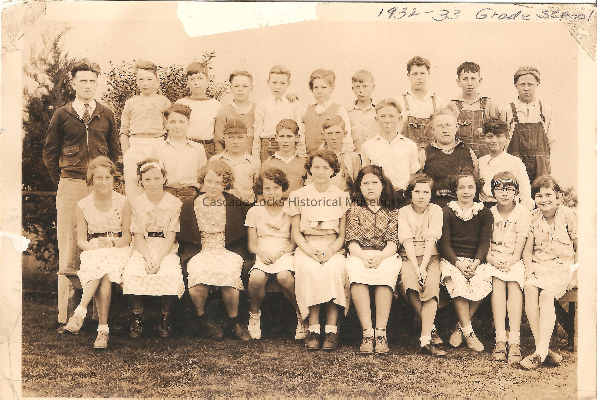 Photograph of a school kids from Cascade Locks posing outside on beaches. There are 26 students and one teacher. Students are positioned in three rows with girls sitting in the front row and boys standing in the back two rows. Students are dressed in warm weather clothing. The male teacher is to the left of the students wearing a button up shirt and tie with front zip jacket. Upper right corner of image says 1932-1933 Grade School.
