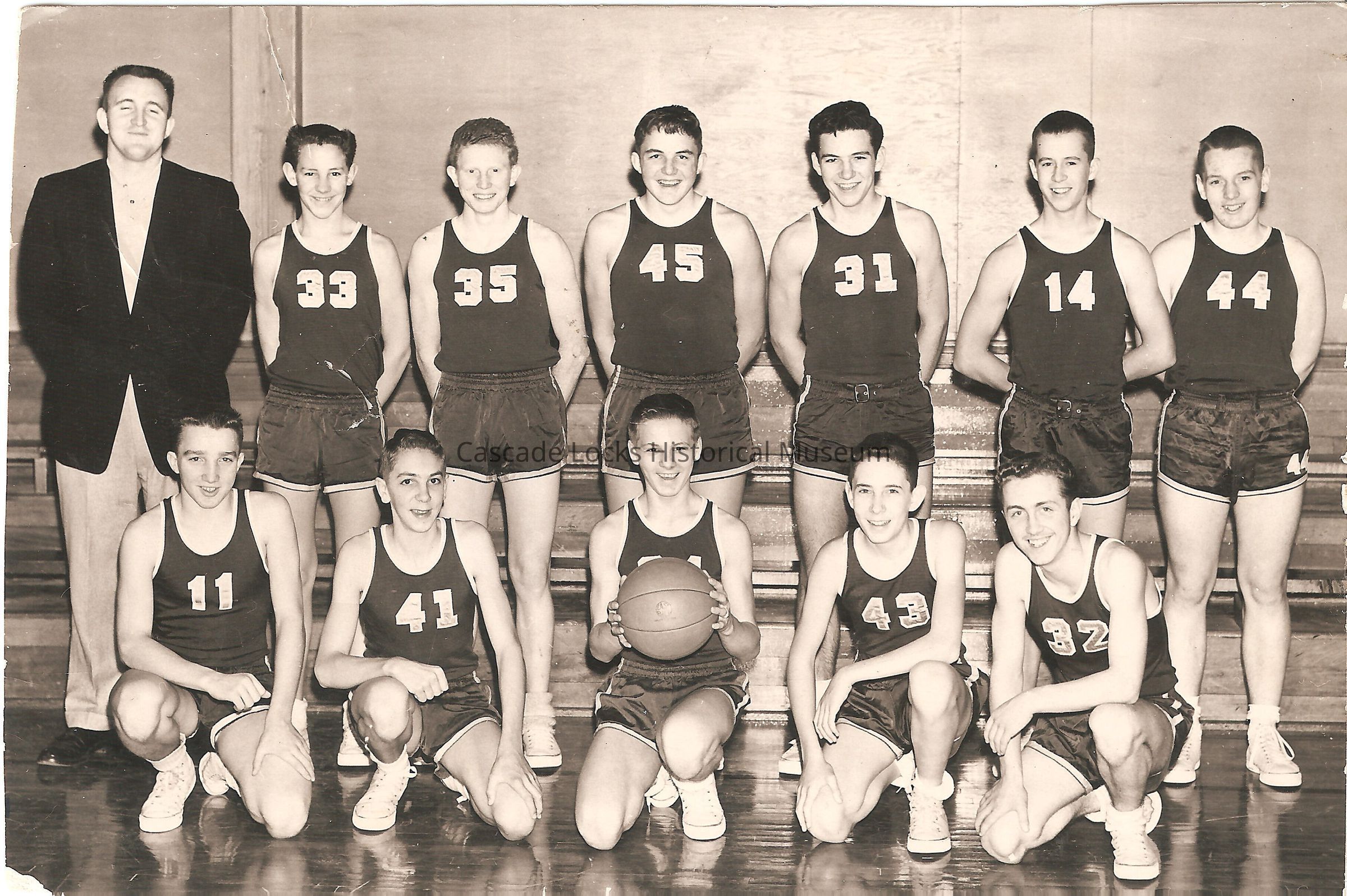 Photograph of a school men's basketball team. The team is made up of 11 players and one couch. The players are in short shorts and and tank tops with numbers on them. The coach is in a button up shirt with a black suit jacket. The middle player in the front row is holding a basketball.