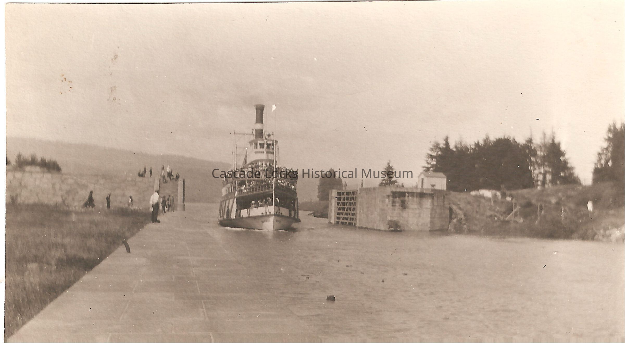 Photograph of a sternwheeler entering the Cascade Locks and Canal west. Photograph is taken looking east.