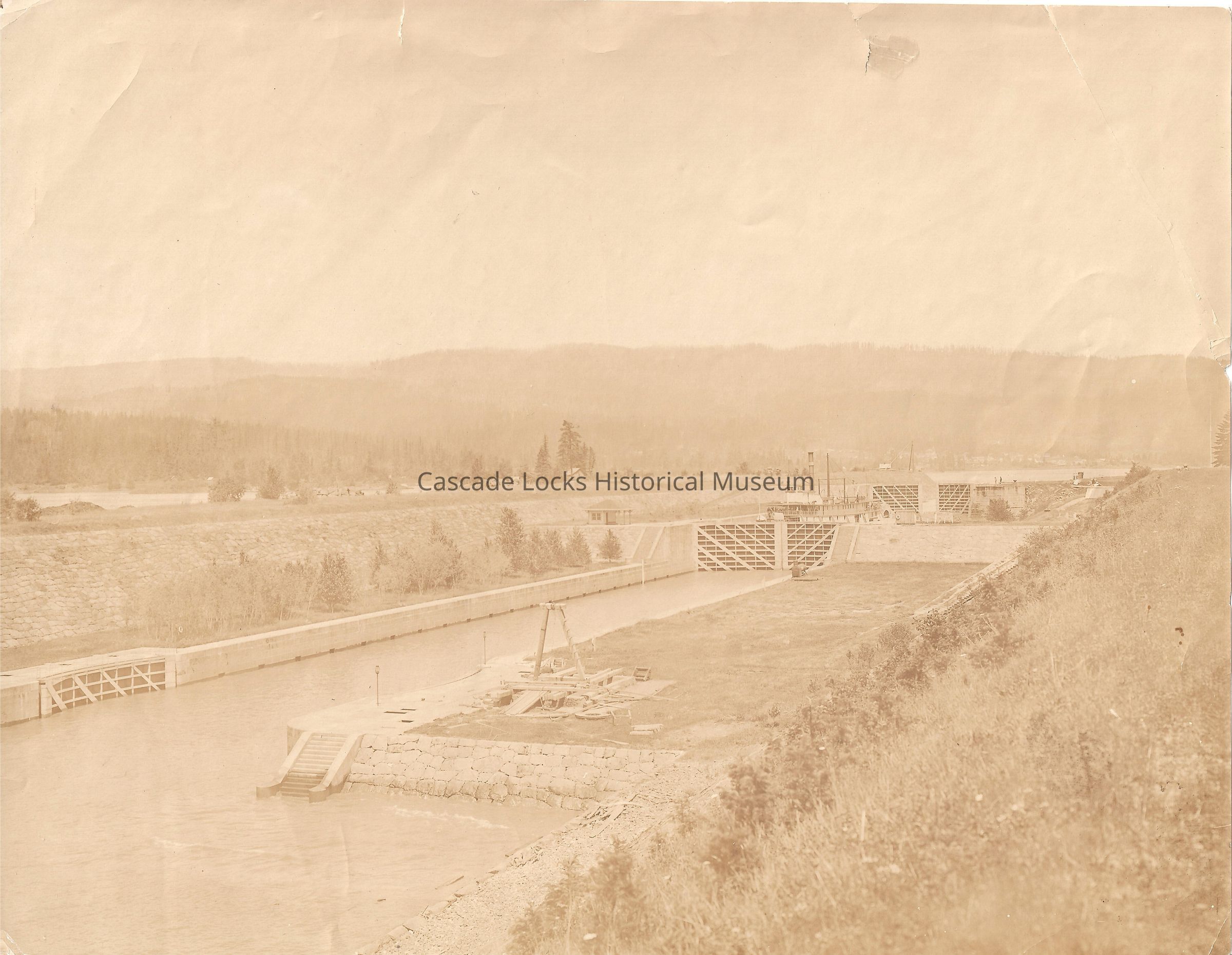 Photograph is of the Cascade Locks and Canal. In the image there is a sternwheeler in the upper locks heading west. There is construction materials on the southern Oregon bank.