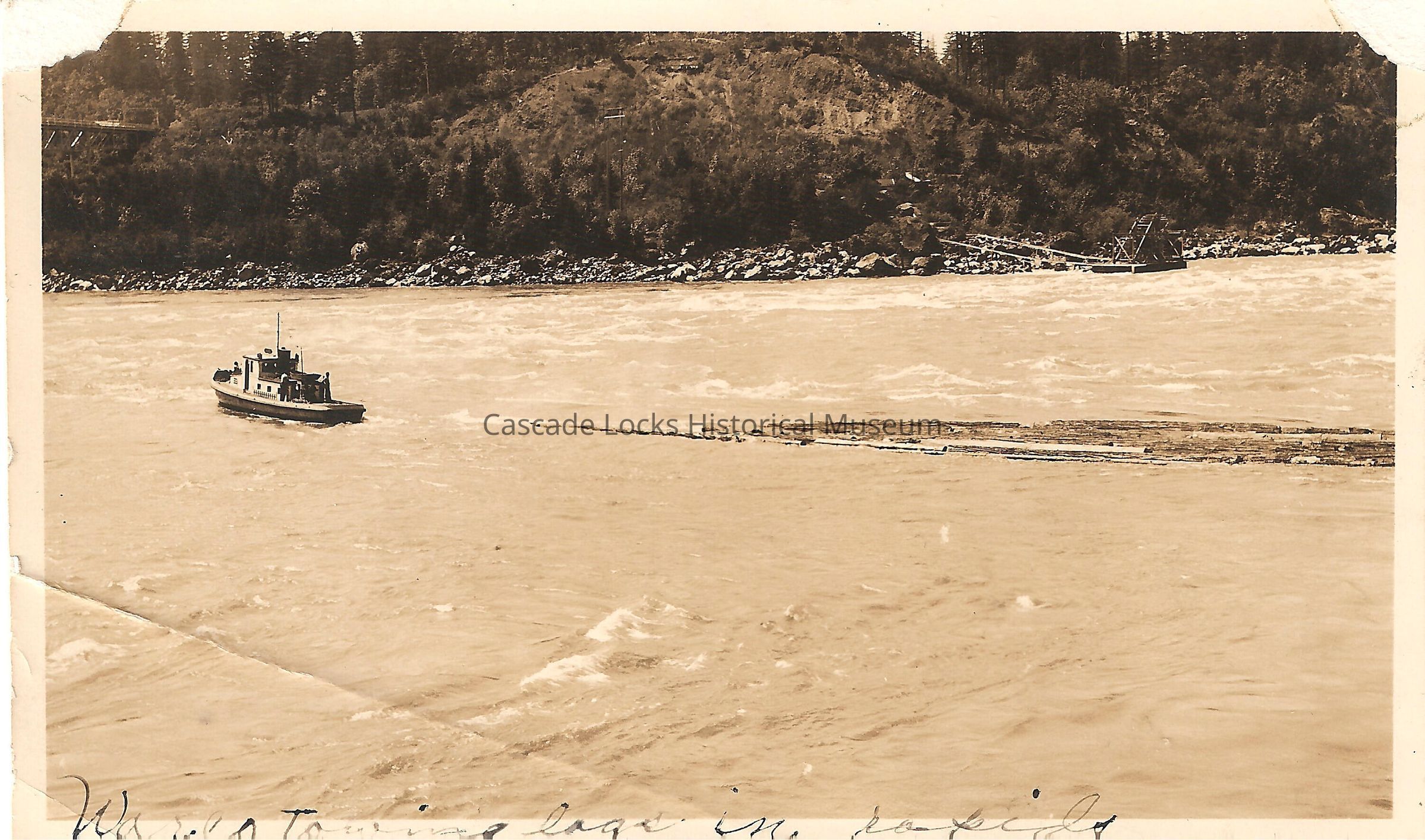 Base of image reads; "Wasco towing logs in rapids."