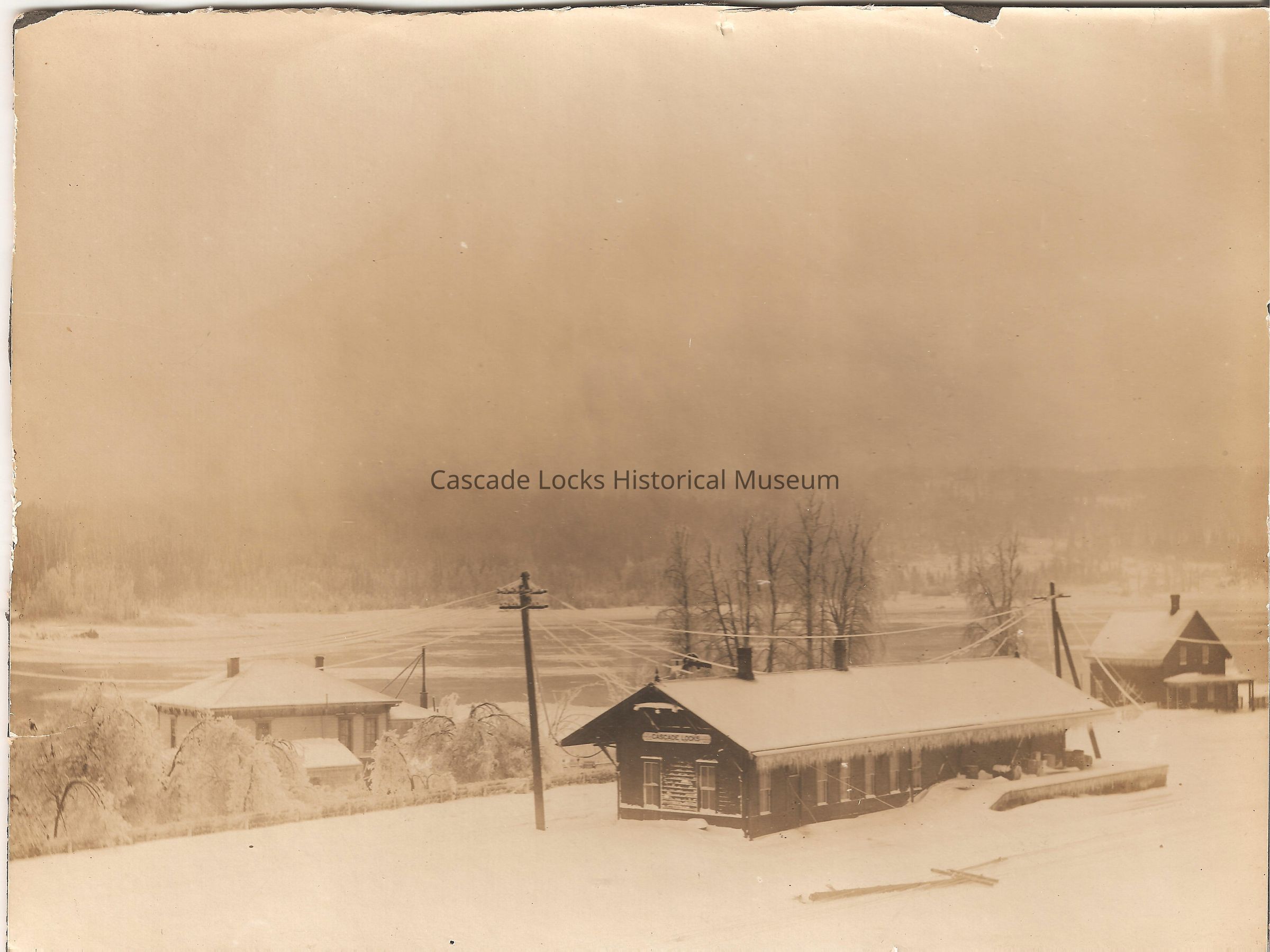 Photograph of the Cascade Locks railroad station in the winter of 1907. In the image the ground and houses are covered in snow. It appears there are fallen powerlines to the right of the trail station from the powerlines cables being pulled downward and one powerline pole laying on the ground. In the image there are two houses visible with the Columbia river behind them in the background.