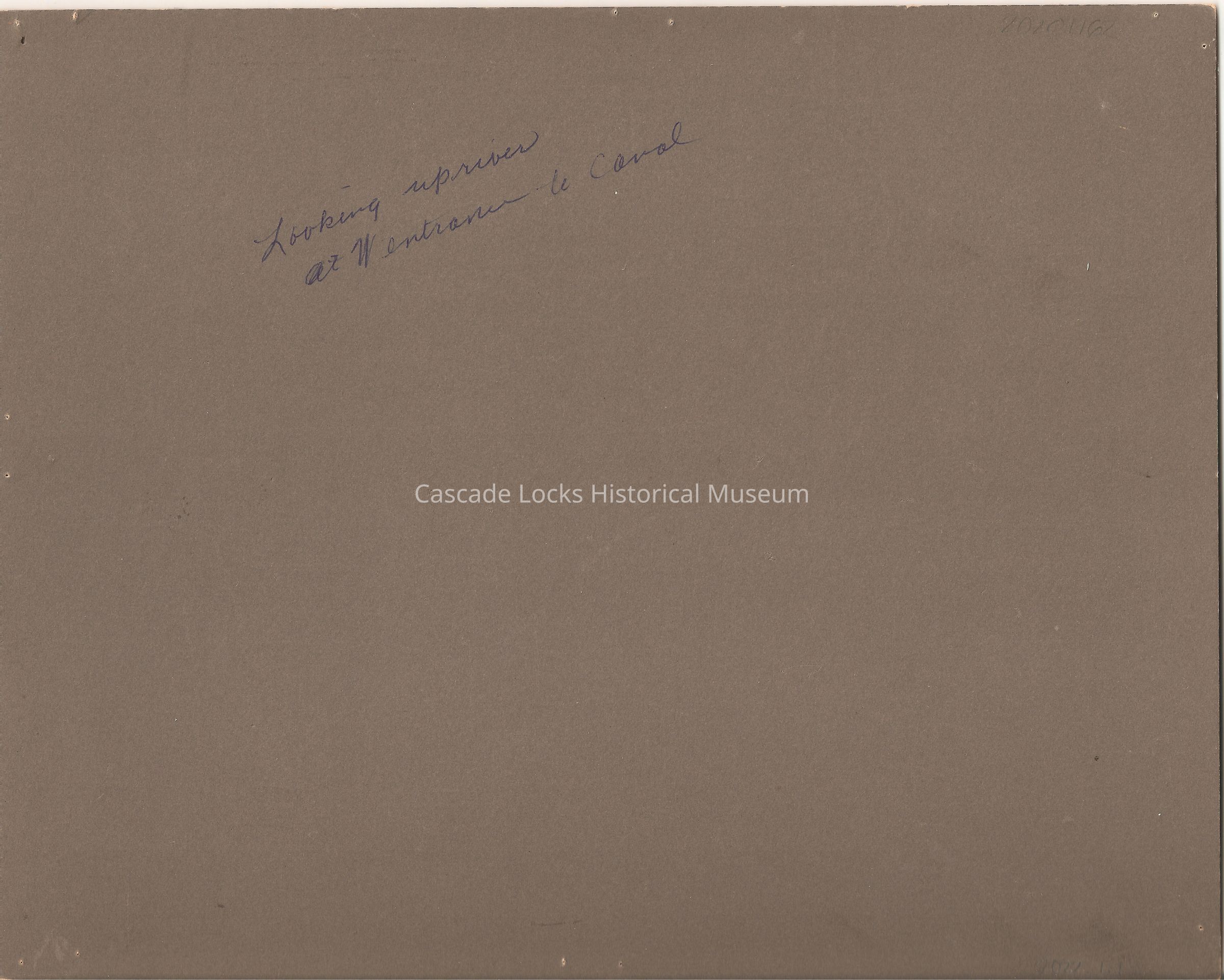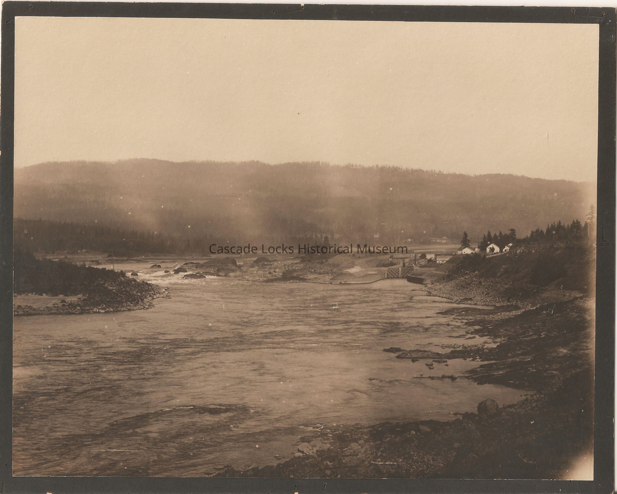 Photograph of the Cascade Locks and Canal from a distance encompassing the Cascade Rapids. In the image there are structures on the Oregon shore of Cascade Locks and Canal. Back of image reads; "Looking upriver at W entrance to Canal"