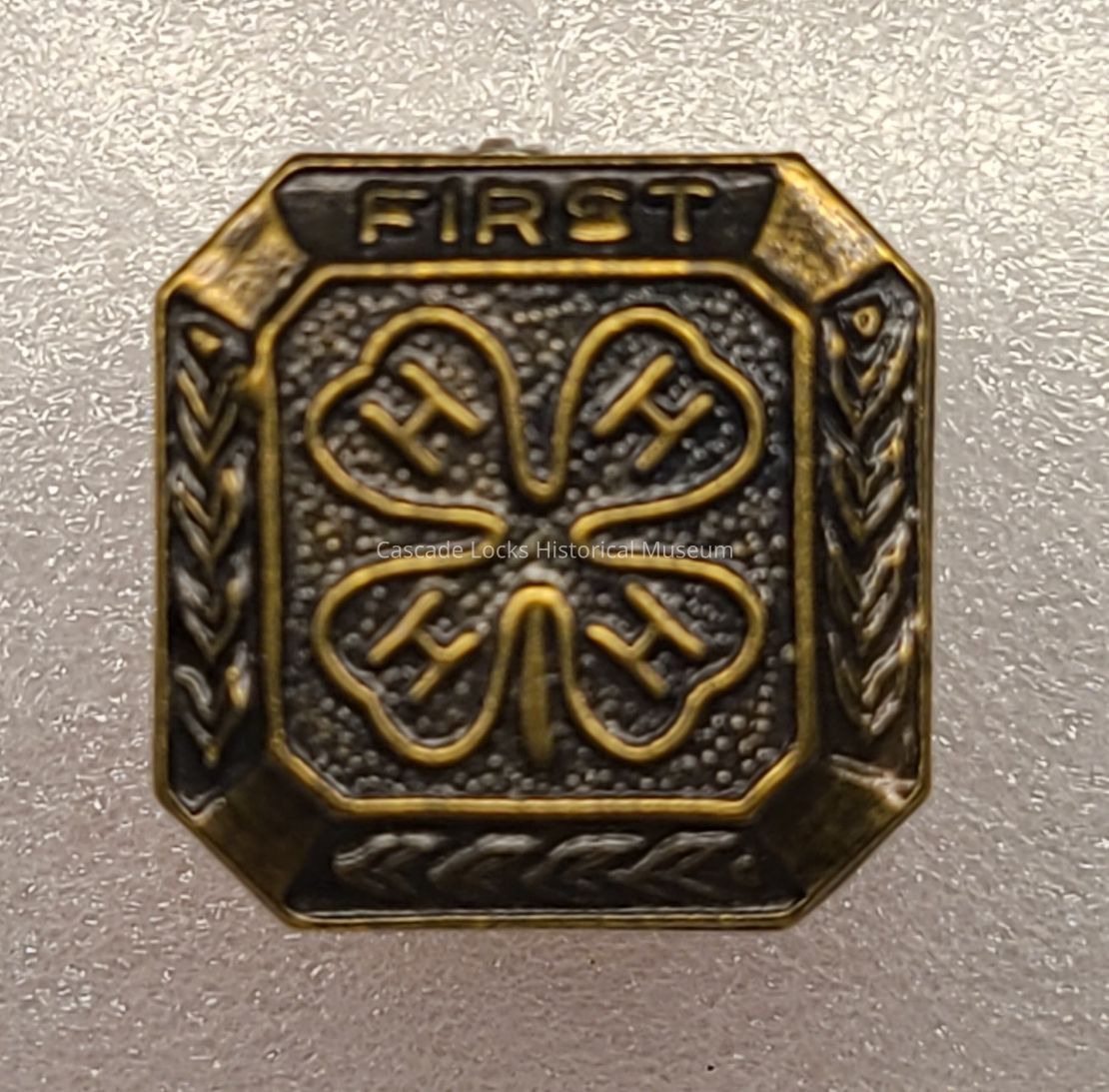 Gold 4H pin with a four leaf clover with H in the leafs. On the top of the pin is the word, "First."