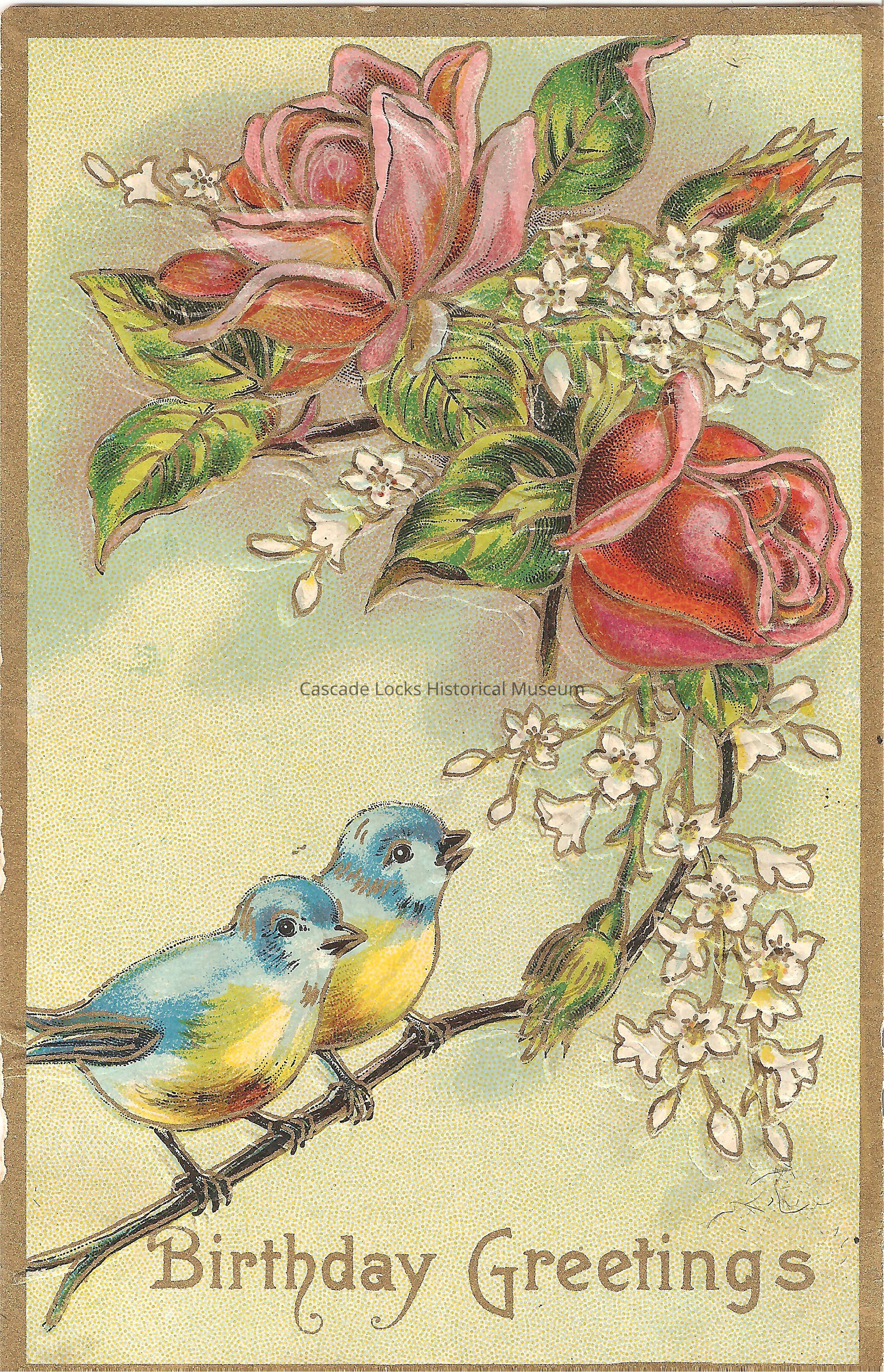 Post Card, illustrated image of roses and flowers with two birds sitting on the branch together. The birds are blue with yellow bellies. The front base of the image reads, "Birthday Greetings."