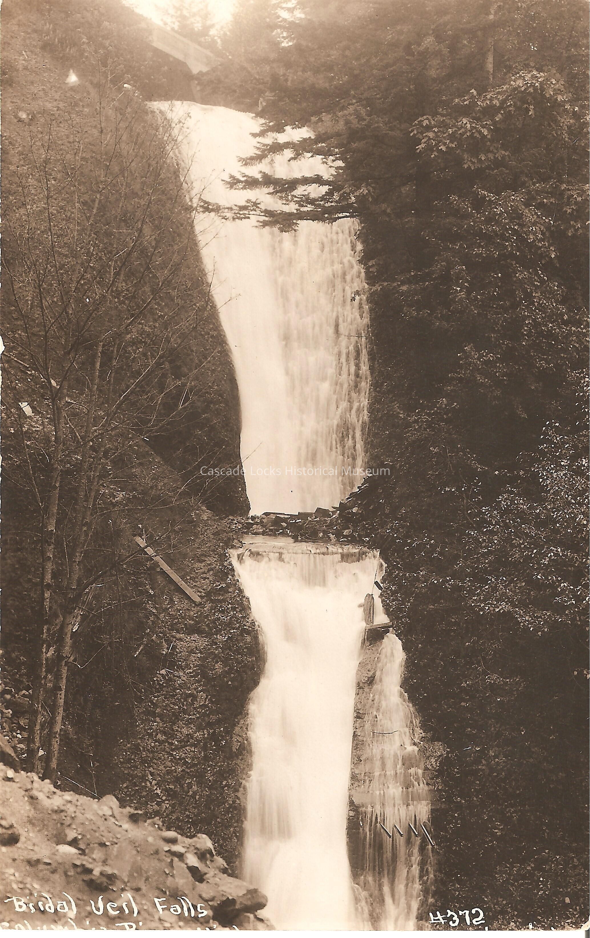 Postcard, image of the Bridal Veil falls on the Columbia River Highway. Card reads, "Bridal Veil Falls, #372." The rest of the printed inscription has been cut off."
