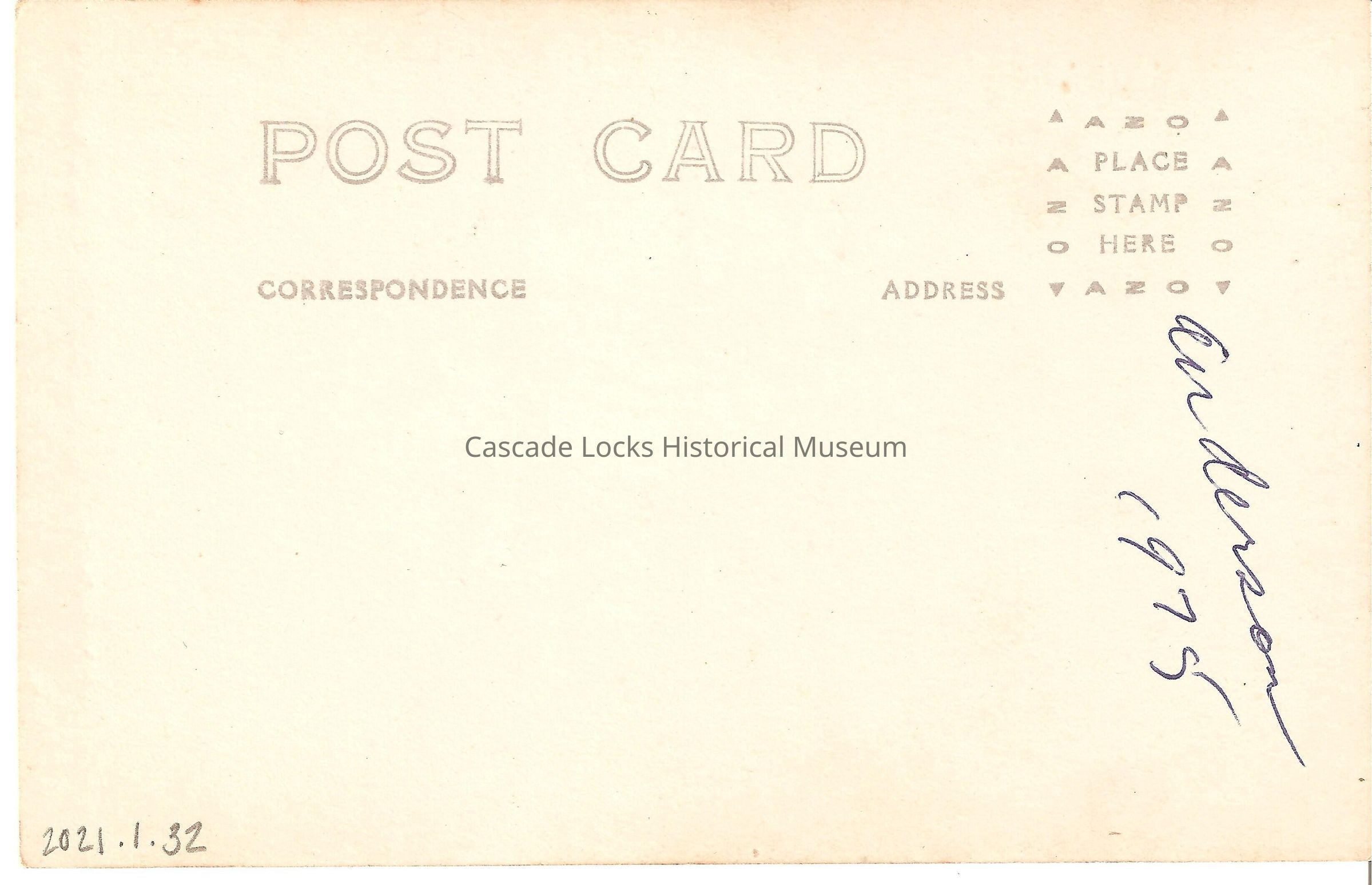 Back of image reads, "Post Card. Correspondence. Address. Place Stamp Here, AZO. Anderson 1975."Lexicon