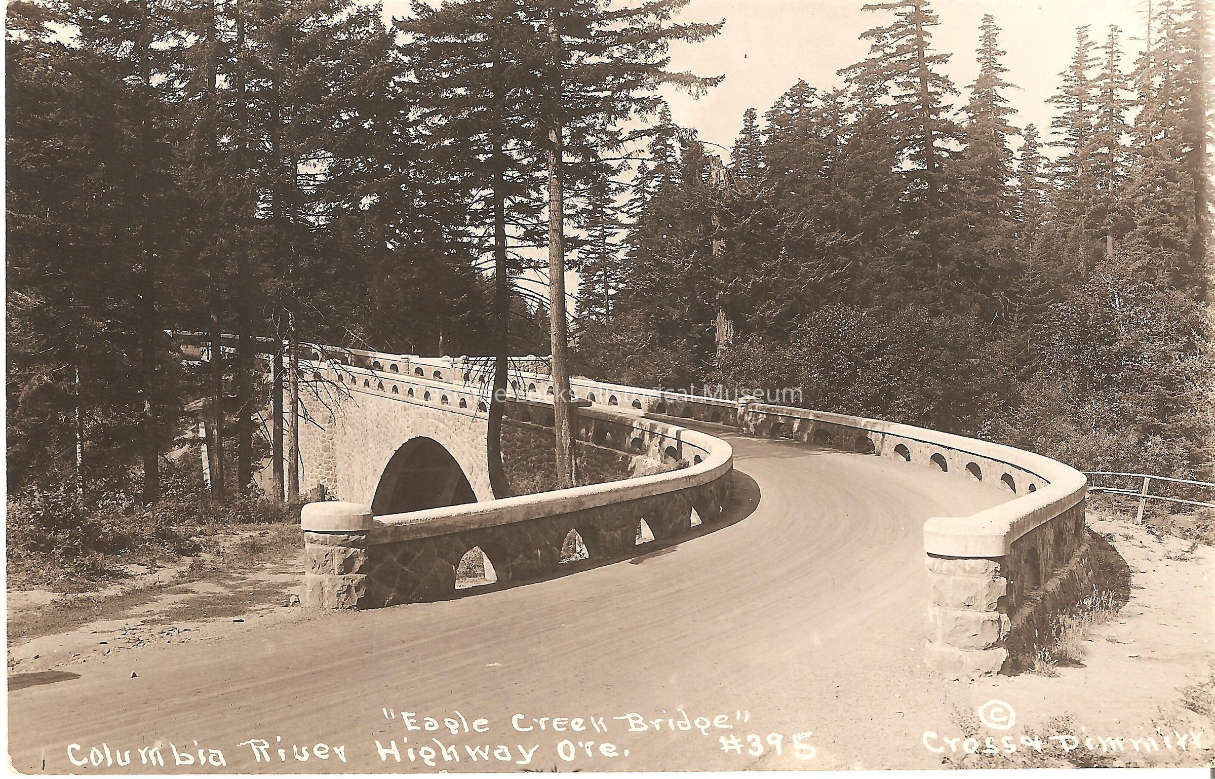 Postcard, image of the Eagle Creek Bridge on the Columbia River Highway. Card reads, "Eagle Creek Bridge, Columbia River Highway, Ore. #395. Cross and Dimmitt."