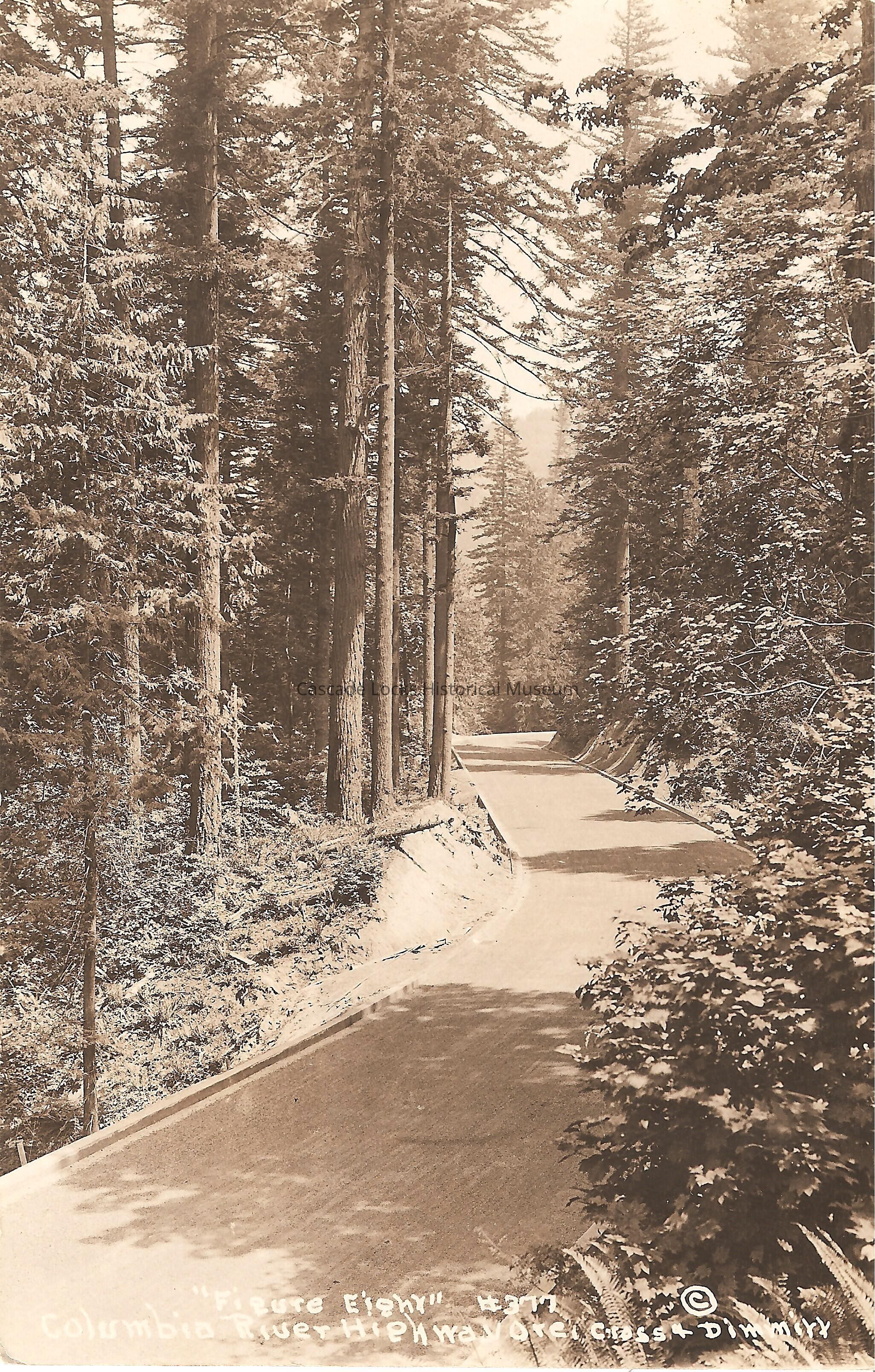 Postcard, image of the Figure Eight on the Columbia River Highway. Card reads, "Figure Eight, #377, Columbia River Highway, Ore, Cross & Dimmitt."