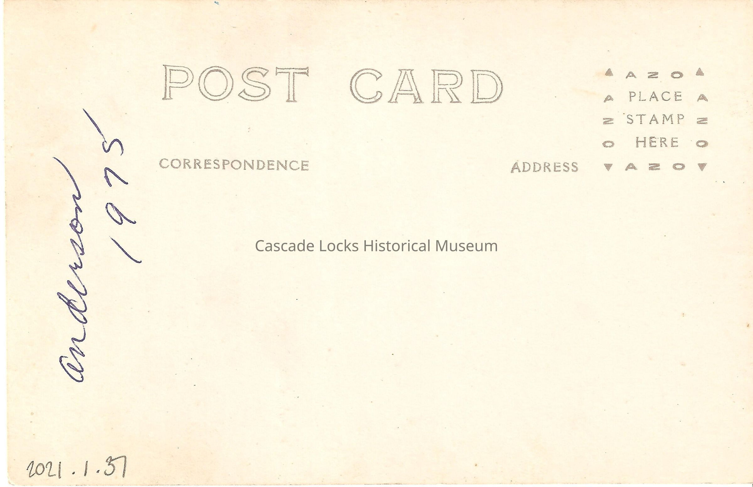 Back of image reads, "Post Card. Correspondence, Address. Place stamp Here, AZO. (Inscription) Anderson 1975."Lexicon