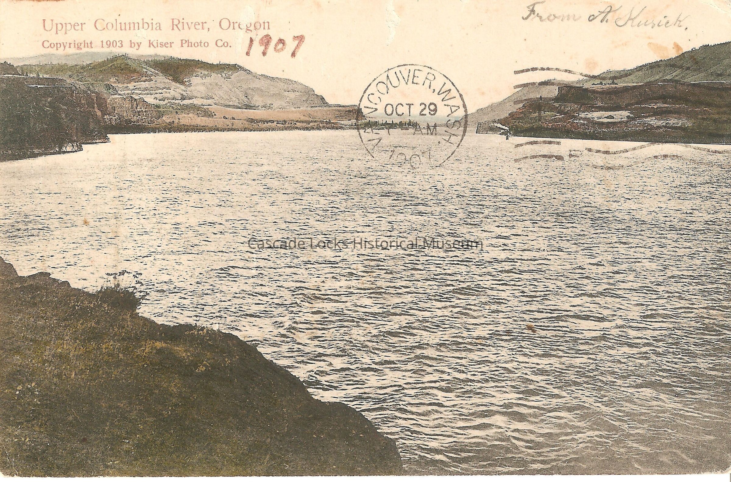 Postcard, illustrated of the Upper Columbia River, Oregon. Card reads, "Upper Columbia River, Oregon. Copywriter 1903 by Kiser Photo Co. From A. Kusiek (Written). Vancouver, Wash. Oct 29, 7AM, 1907. (Postmark.)"