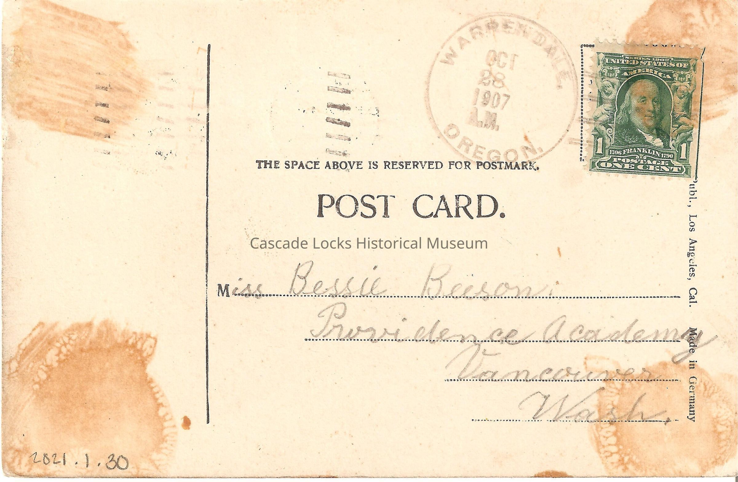 Back of image reads, "Post Card. The Space Above Is Reserved For Postmark. Warrendale, Oregon. Oct 28, 1907, AM. Miss Bessie Buson, Providence Academy, Vancouver, Wash. Publ., Los Angeles, Cal. Made in Germany. United States of America 1706-1790 Franklin, Postage One Cent (Stamp)"Lexicon