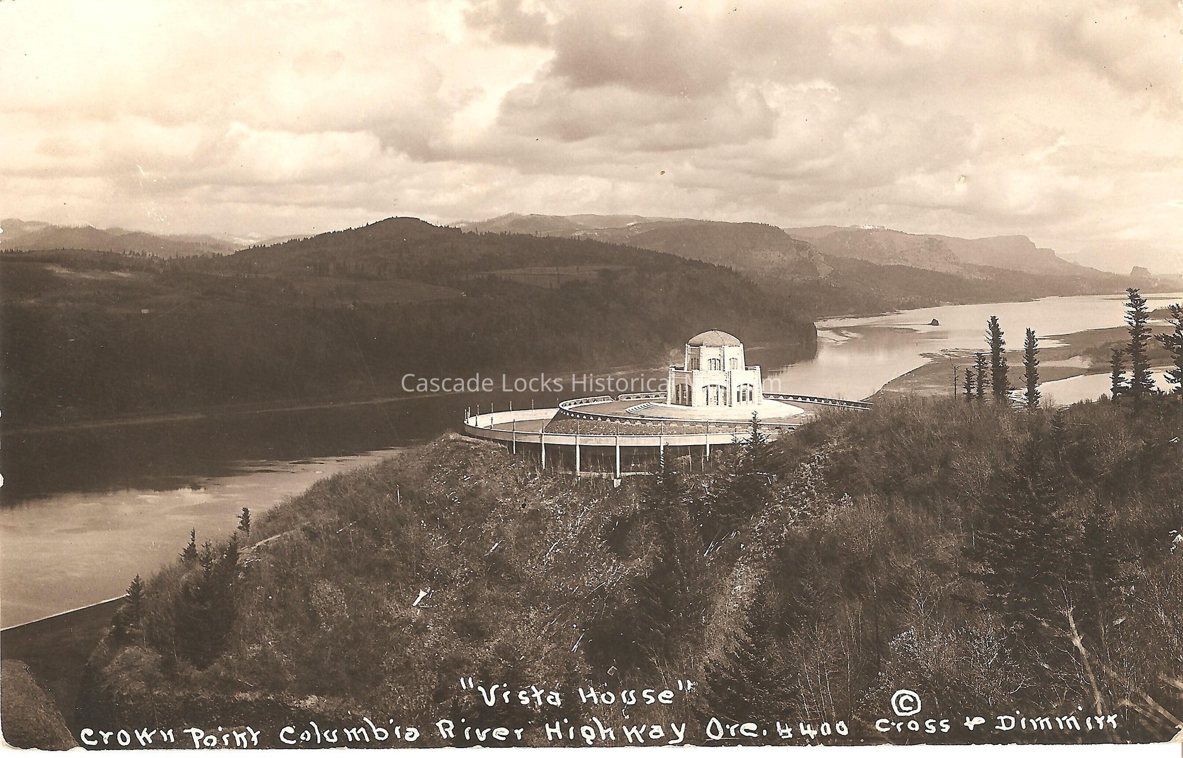 Postcard, image of Crown Point with the Vista House showing. Card reads, "Vista House, Crown Point, Columbia River Highway, Ore. #400. Cross & Dimmitt."