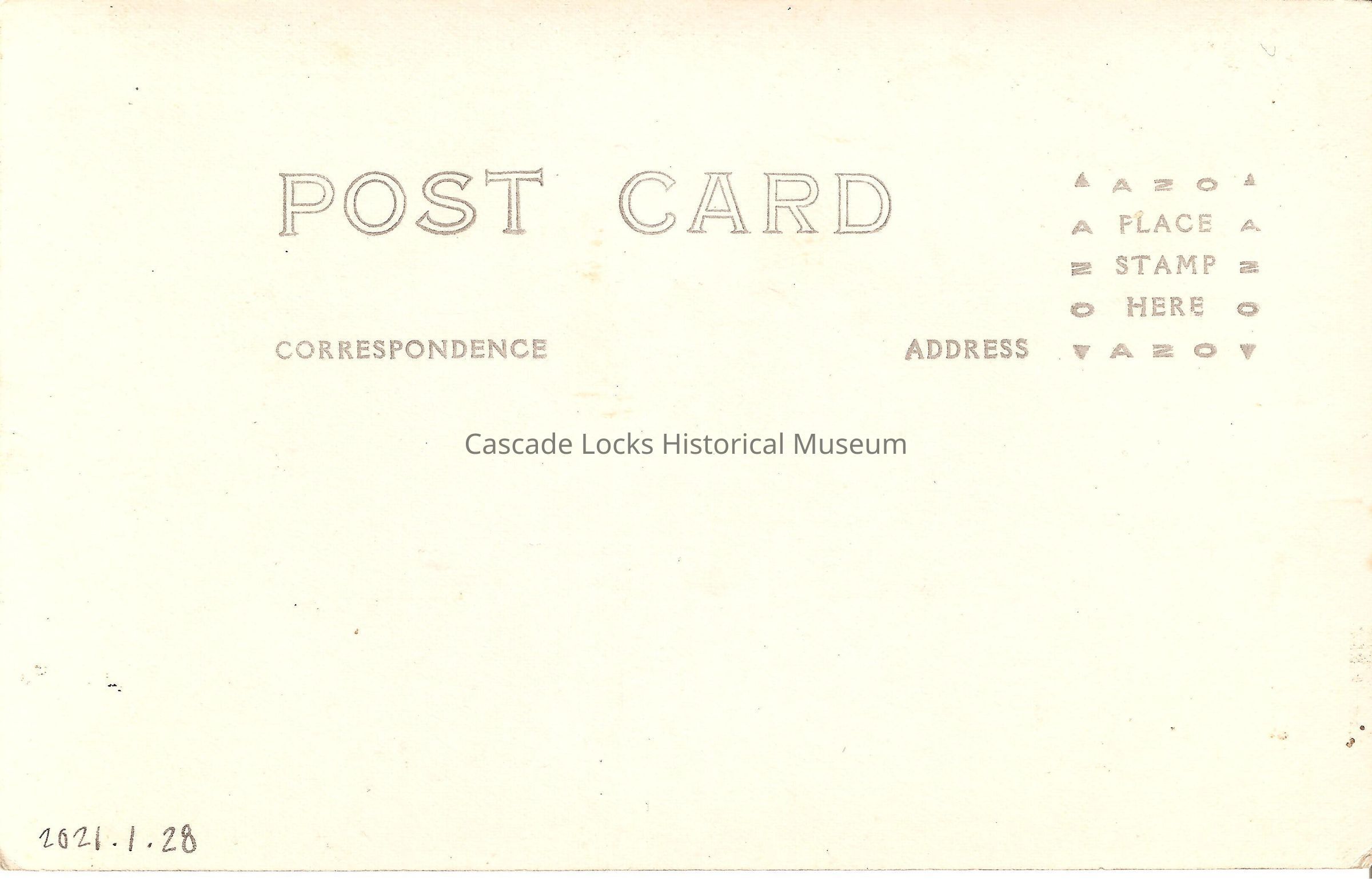 Back of image reads, "Post Card. Correspondence. Address. Place Stamp Here, AZO."Lexicon