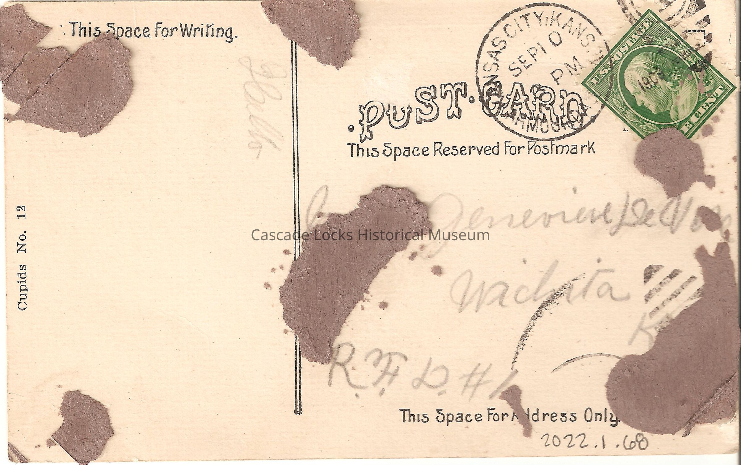 Back of image reads, "Post Card. This Space for Writing- Hello. This Space Reserved For Postmark. This Space For Address Only. Cupids No. 12. Genevieve DeVo, Wichita. R. H. D. #1. Kansas City. Kans.Sep 10, 3PM, 1909. U.S. Postage, One Cent."Lexicon