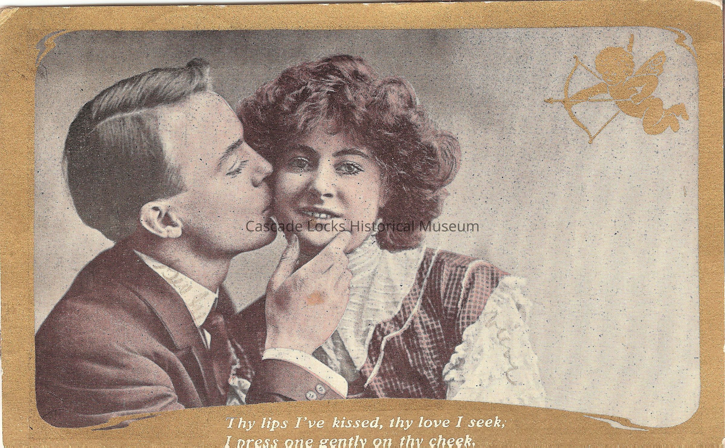 Postcard, illustration of a couple. Card reads, "Thy lips I've kissed, thy love I seek, I press one gently on thy cheek."