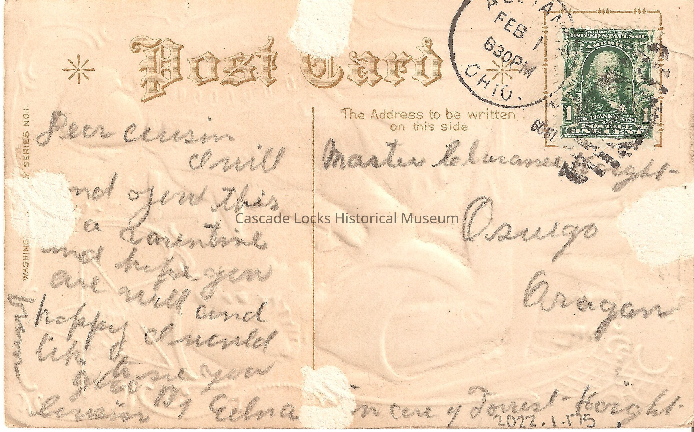 Back of image reads, "Post Card. Dear Cousin, I will send you this as a Valentine and hope you ae well and happy I would like to see you (?), from Cousin Edna. The Address to be written on this side- Only- Master Clarence Haight, Oswego, Oregon. c/o James Haight. Washington Series No. 1. Alliance Ohio Feb 1, 830PM, 1909. United States of America 1706-1790 Franklin, Postage One Cent (Stamp)"Lexicon