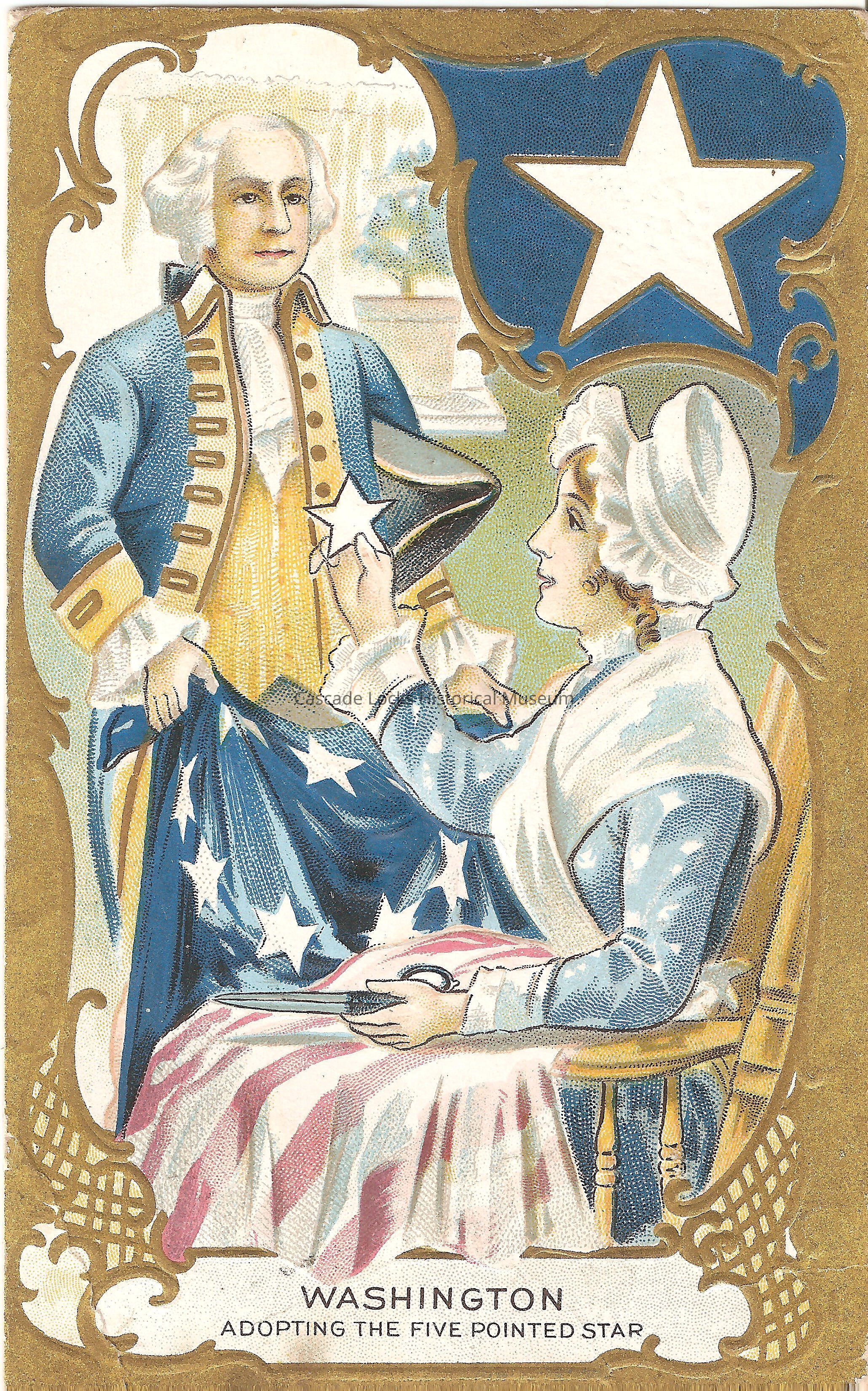 Post Card, illustrated image of Gorge Washington speaking to a women about putting the 5 pointed star on the national flag. Base of image reads, "Washington Adopting the Five Pointed Star."
