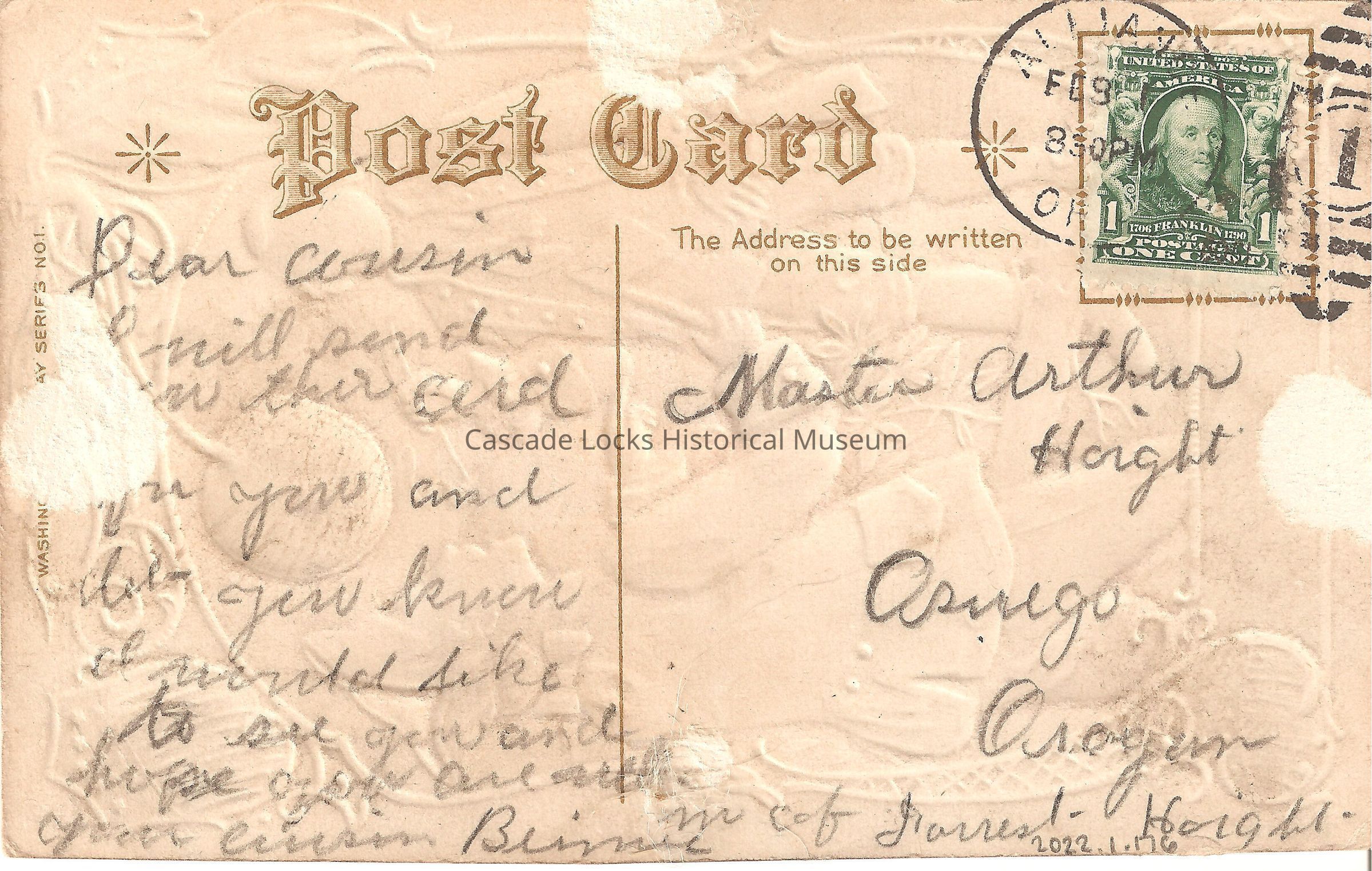 Back of image reads, "Post Card. Dear Cousin, I will send you there card for you and (?) you know I would like to see you and hope you are well, your Cousin Bernice. The Address to be written on this side- Only- Master Arthur Haight, Oswego, Oregon. c/o James Haight. Washington Series No. 1. Alliance Ohio Feb 1, 830PM. United States of America 1706-1790 Franklin, Postage One Cent (Stamp)"Lexicon