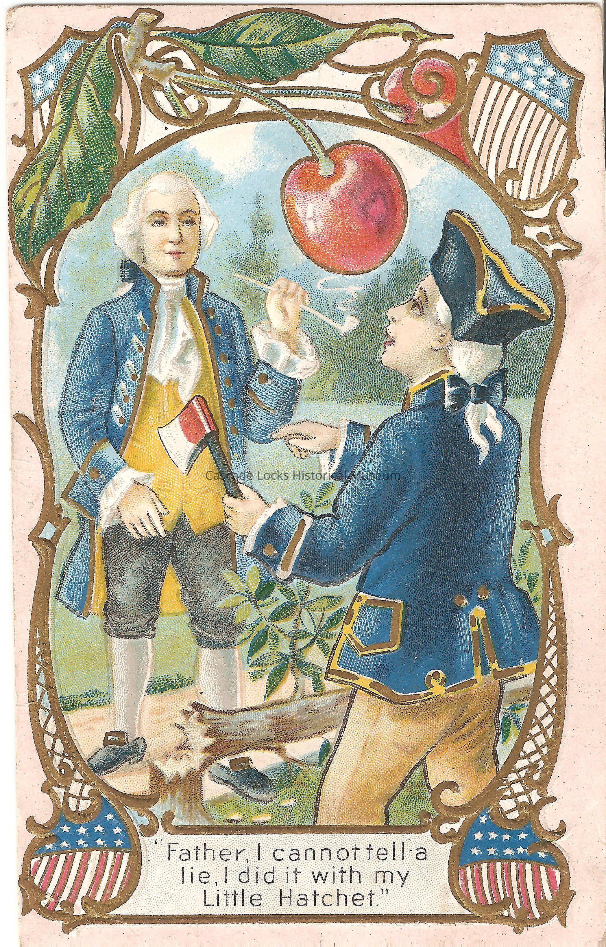 Post Card, illustrated image of a young Gorge Washington speaking to his father about a cherry tree. The base of the image reads, "Father, I cannot tell a lie. I did it with my little hatchet."