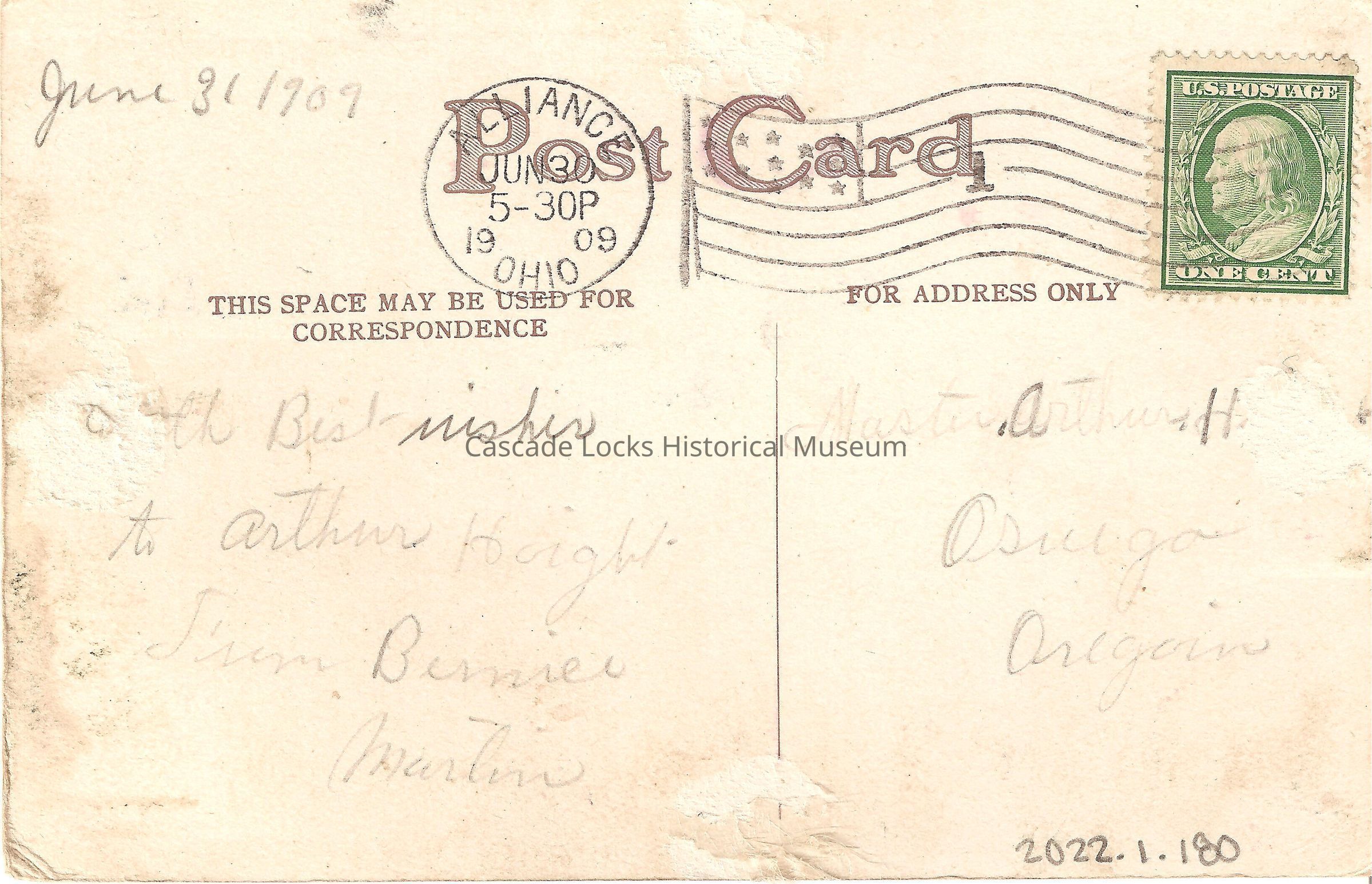 Back of image reads, "Post Card, This Space May Be Used For Correspondence- The best wishes to another Haight. I'm Bernice Mailin. For Address Only- Master Arthur H. Oswego, Oregon. U.S. Postage, One Cent. Alliance, Ohio. June 30, 530PM, 1909."Lexicon